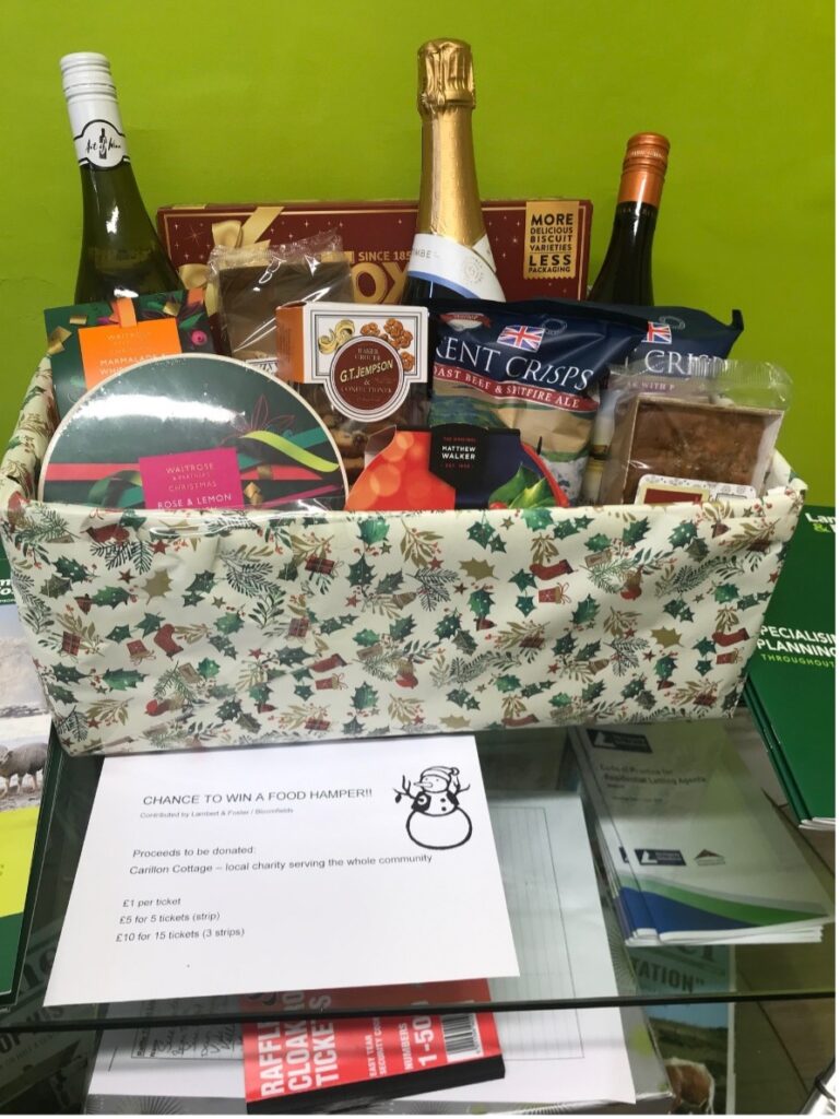 Lambert & Foster and Bloomfields are proud to announce that their Christmas Hamper raffle raised £110 for Carillon Cottage, Wadhurst, a local charity.