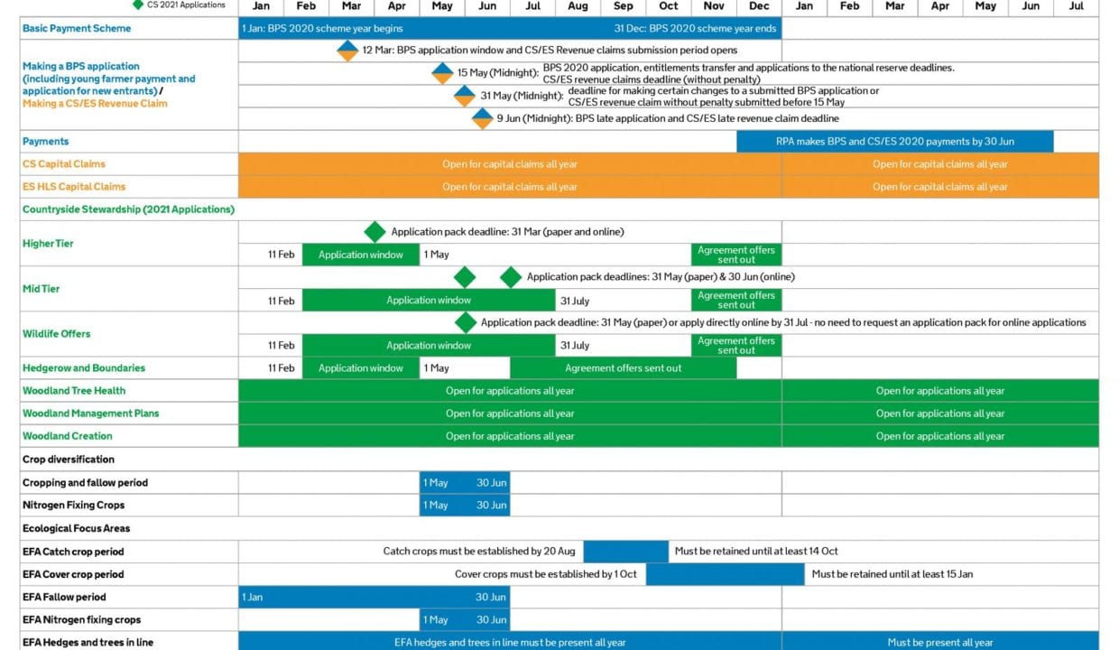 The RPA has published a “Key Dates 2020” timeline for BPS, Countryside Stewardship (CS) and Environmental Stewardship (ES) on GOV.UK. This document confirms:- Mid Tier and Higher