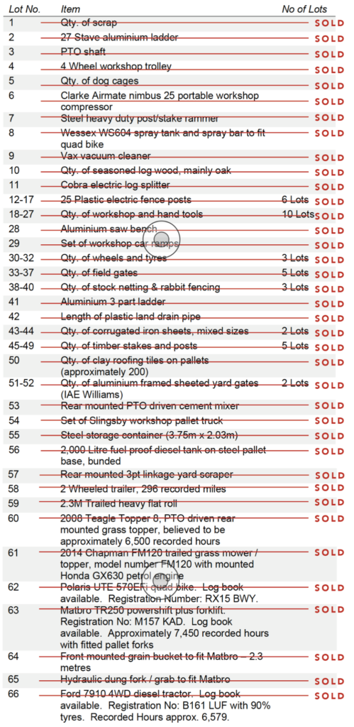 “We were presented with a small selection of good quality machinery, together with the usual items that you find around a farm when you decide to retire. I am pleased we achieved some excellent prices with competitive tenders for the more valuable machinery, but also a clearance of the more awkward items that would not have justified spending money on moving to a sale field. Whilst we love auctions, on this occasion, a tender proved to be exactly the right approach.”