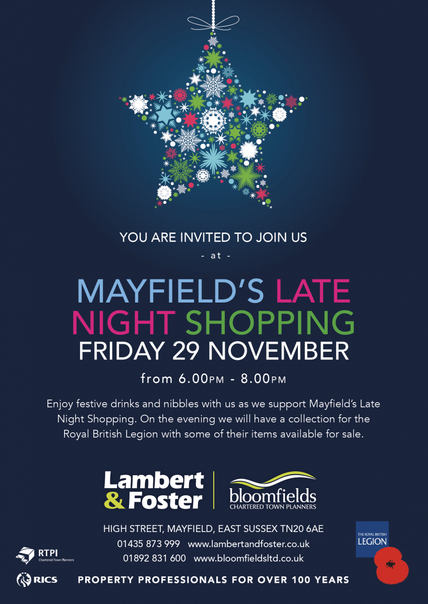 Enjoy festive drinks and nibbles with us as we support Mayfield’s Late Night Shopping. On the evening we will have a collection for the Royal British Legion with some of their items available for sale.