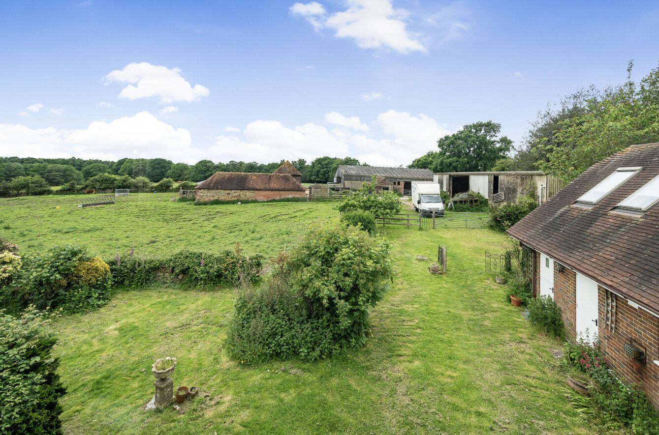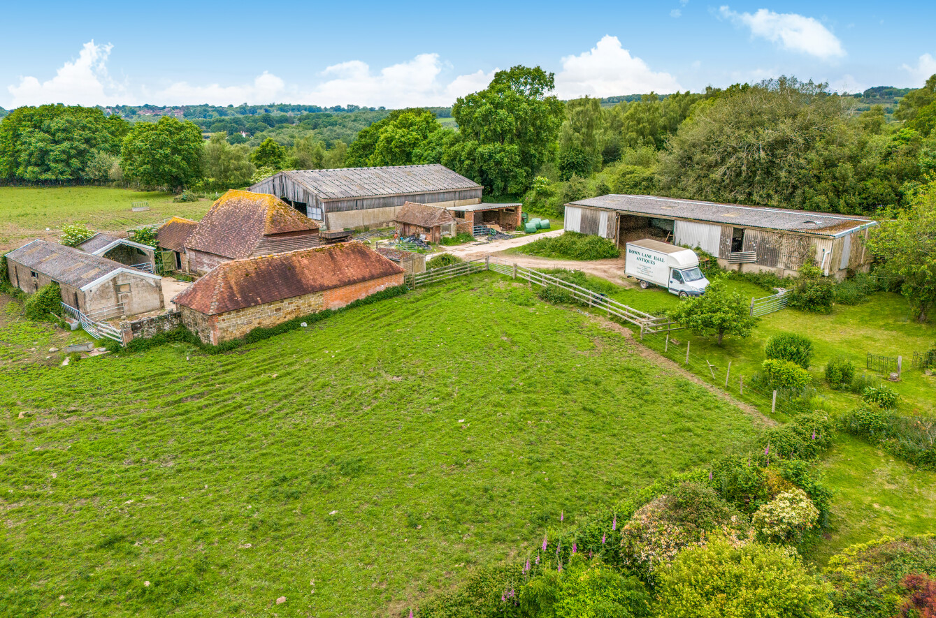 From the Crowborough High Street head west on the A26 for approximately 2.6 miles then turn right onto New Road. Follow New Road to the end then turn left onto the B2026 and continue for some 1.2 miles before turning right into the driveway. Go over the cattle grid and keep left, then follow the shared driveway through the wooded area. The entrance to the farmhouse can be found on the left hand side via an electric gate. Entrance to the yard and buildings are on the left hand side once you exit the woods.