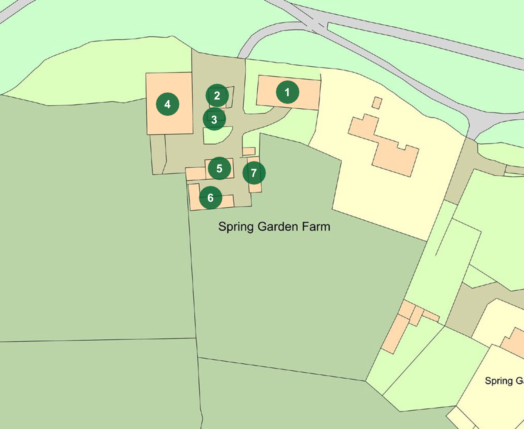 The buildings to the west of Spring Garden Farmhouse comprise (see buildings plan):