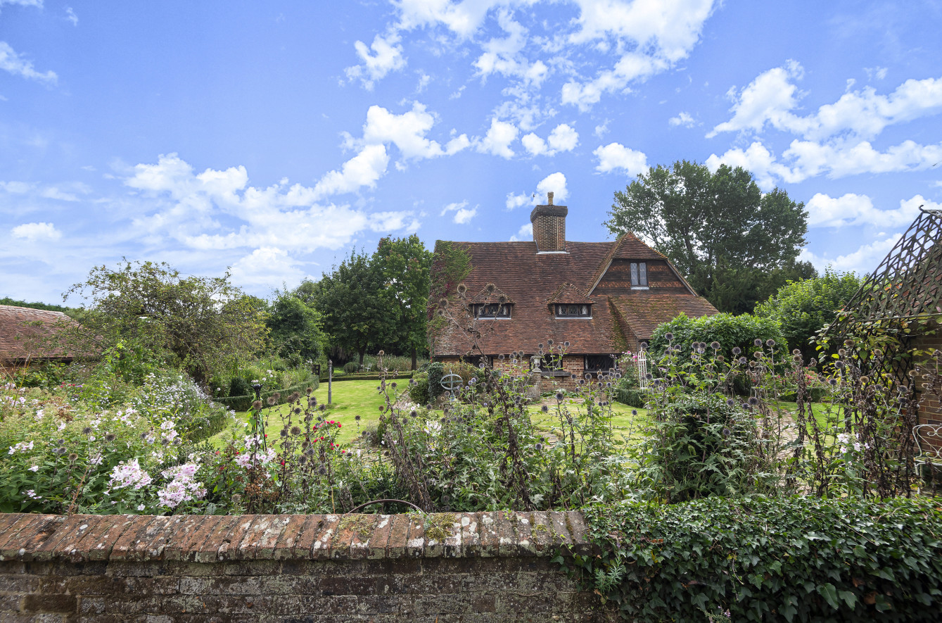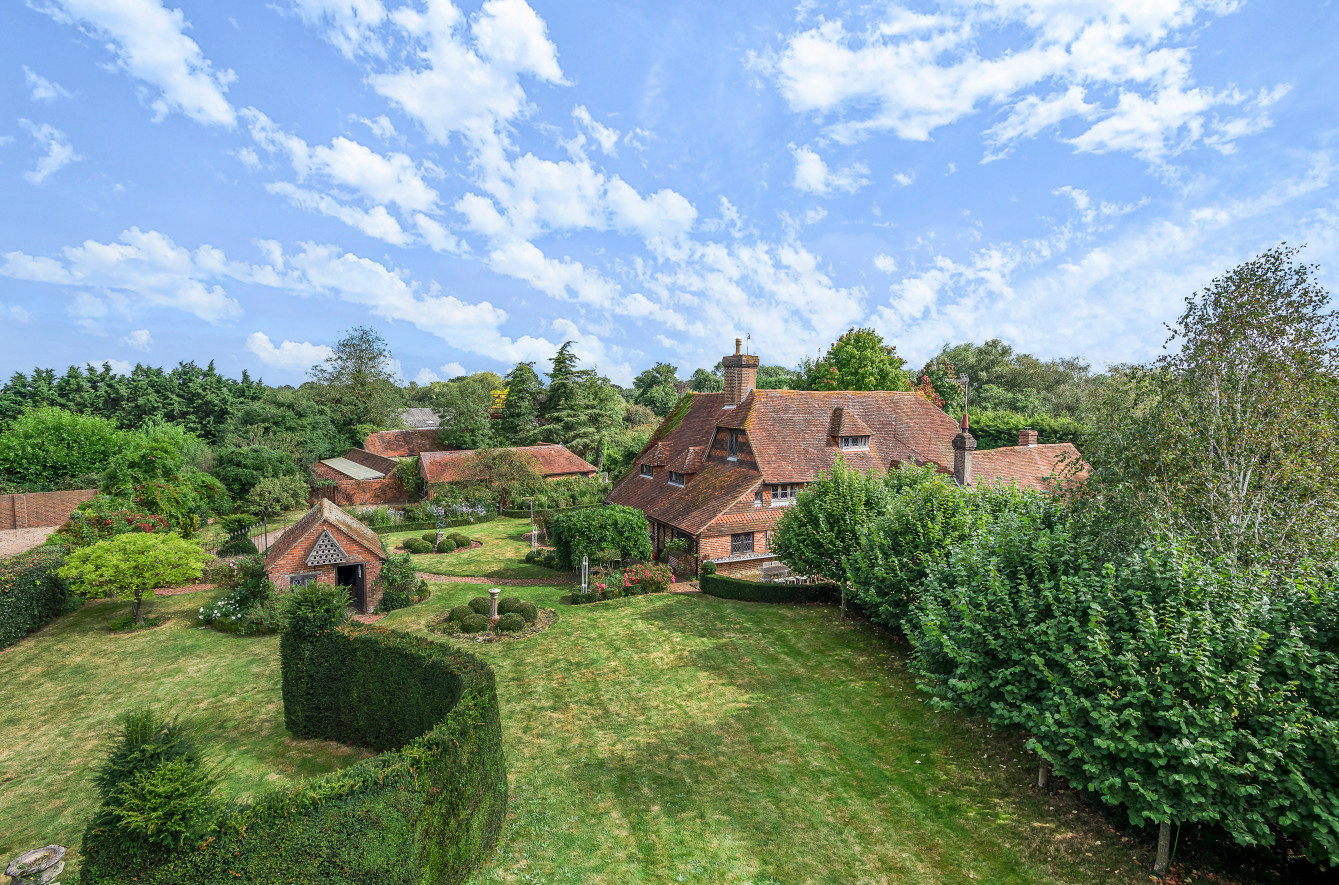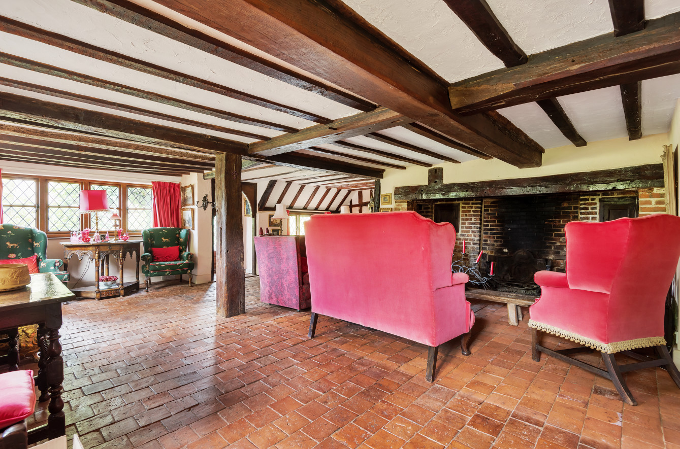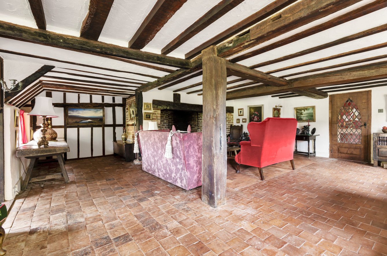 Great Old Hay is an unlisted, timber framed period farmhouse, presenting attractive elevations of brick and tile hanging set with oak framed, single glazed, leaded light casement and dormer windows beneath a pitched and half hipped tiled roof with catslide to rear. The character accommodation is arranged over three floors with many features indicative of the period including a wealth of exposed timbers, inglenook fireplaces, heavy ledged and braced doors, brick and quarry tiled floors together with some low ceilings and doorways. Scope now exists for sympathetic updating and improvement. The accommodation includes a drawing room with an impressive inglenook fireplace, a sitting-room/dining room with vaulted ceiling and inglenook fireplace housing a wood-burning stove, a kitchen with bespoke handmade units, gas twin oven Aga and quarry tiled floor, two separate studies and a dining room with an impressive inglenook housing a woodburning stove. An oak staircase provides access to the first-floor landing with exposed oak floorboards and access to the main bedroom with an en suite bathroom and three further bedrooms a family bathroom. Bedrooms five, six and seven together with a second family bathroom are arranged over the second floor, set partially beneath eaves.