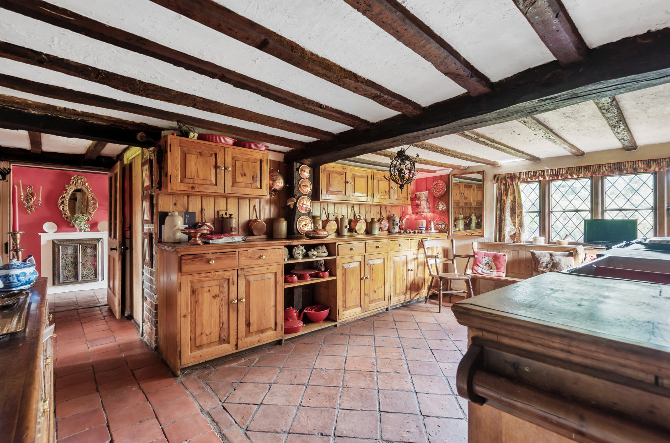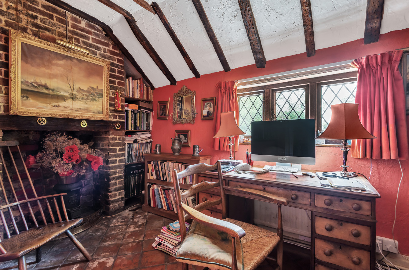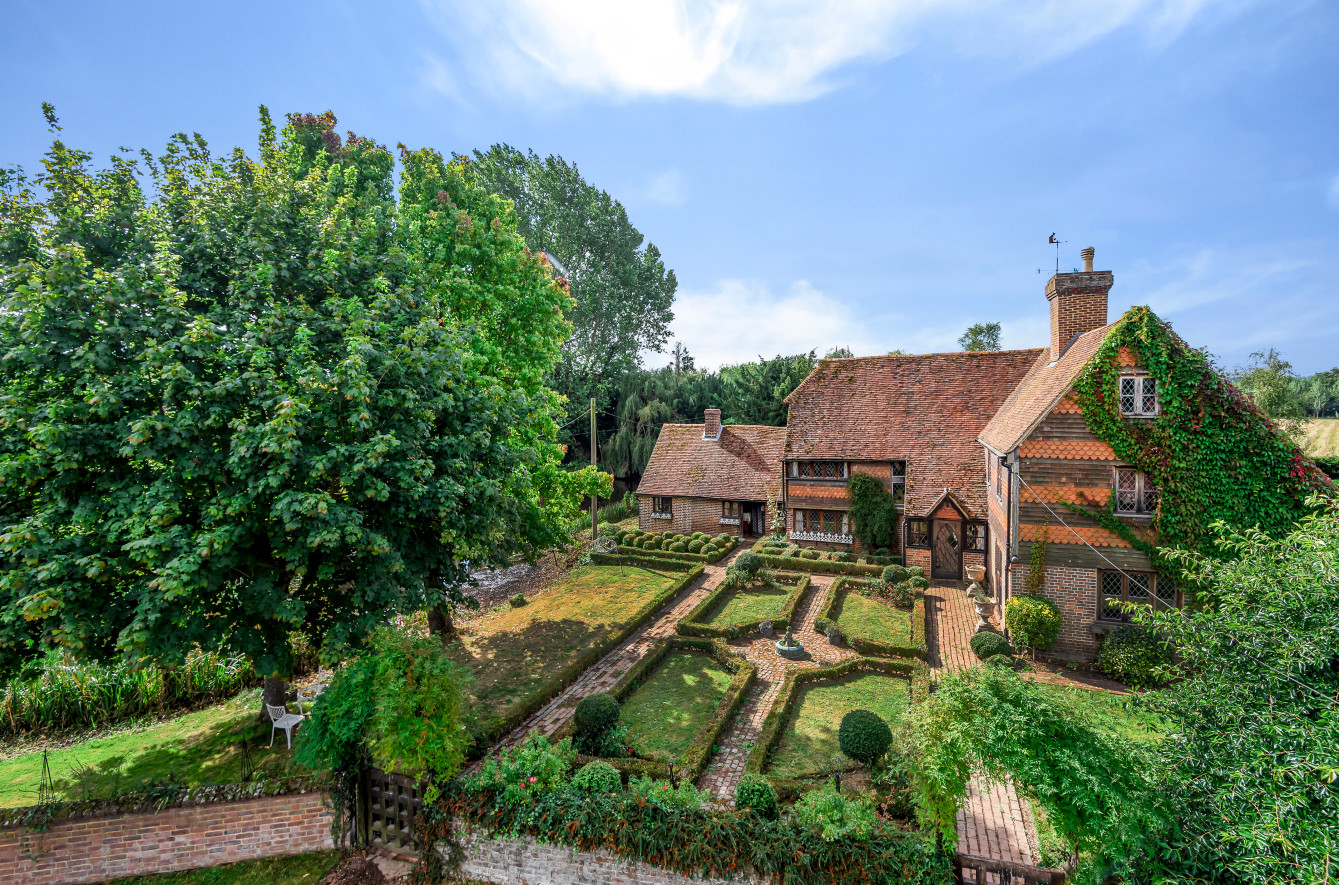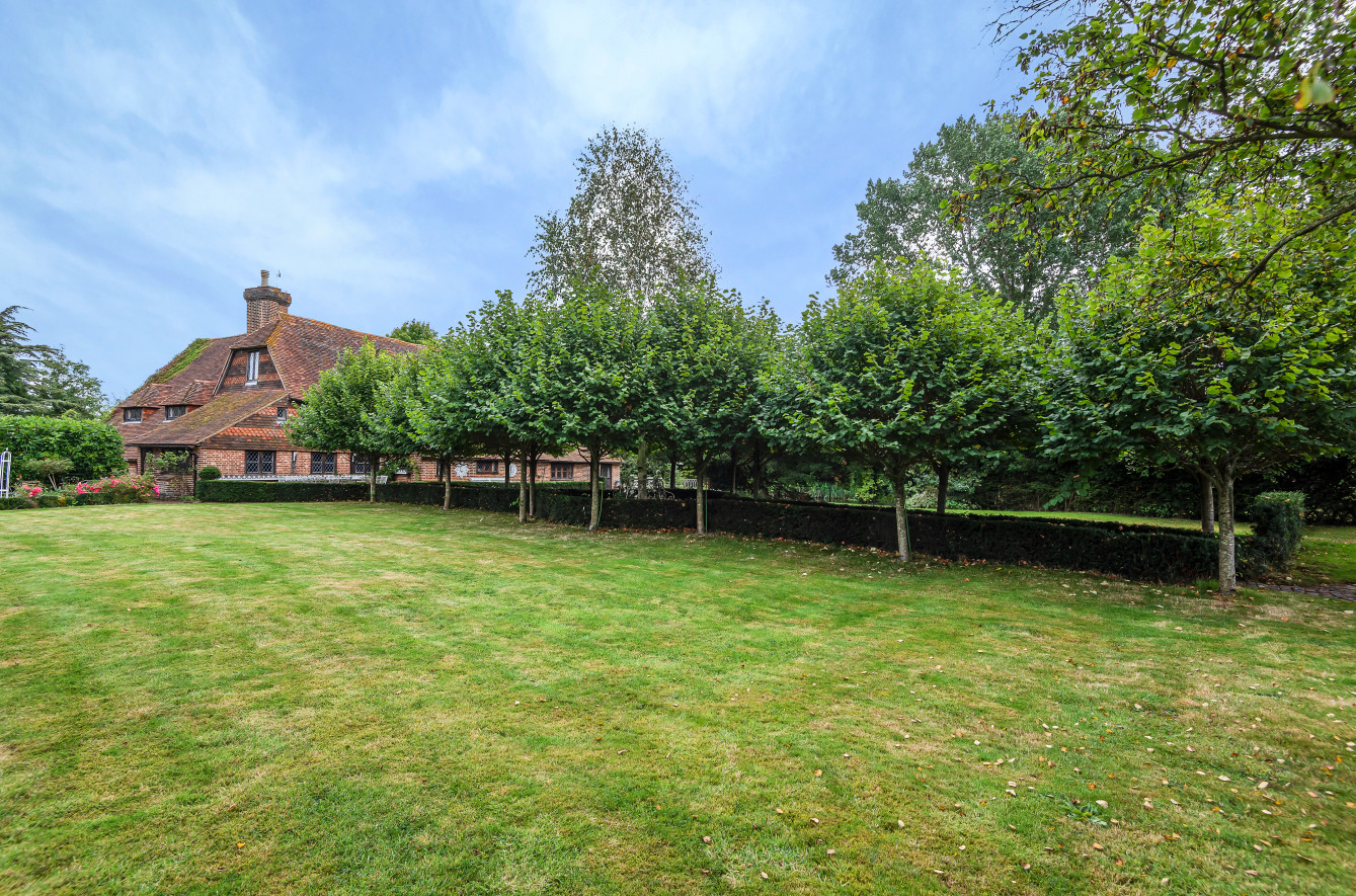 Great Old Hay is an unlisted, timber framed period farmhouse, presenting attractive elevations of brick and tile hanging set with oak framed, single glazed, leaded light casement and dormer windows beneath a pitched and half hipped tiled roof with catslide to rear. The character accommodation is arranged over three floors with many features indicative of the period including a wealth of exposed timbers, inglenook fireplaces, heavy ledged and braced doors, brick and quarry tiled floors together with some low ceilings and doorways. Scope now exists for sympathetic updating and improvement. The accommodation includes a drawing room with an impressive inglenook fireplace, a sitting-room/dining room with vaulted ceiling and inglenook fireplace housing a wood-burning stove, a kitchen with bespoke handmade units, gas twin oven Aga and quarry tiled floor, two separate studies and a dining room with an impressive inglenook housing a woodburning stove. An oak staircase provides access to the first-floor landing with exposed oak floorboards and access to the main bedroom with an en suite bathroom and three further bedrooms a family bathroom. Bedrooms five, six and seven together with a second family bathroom are arranged over the second floor, set partially beneath eaves.