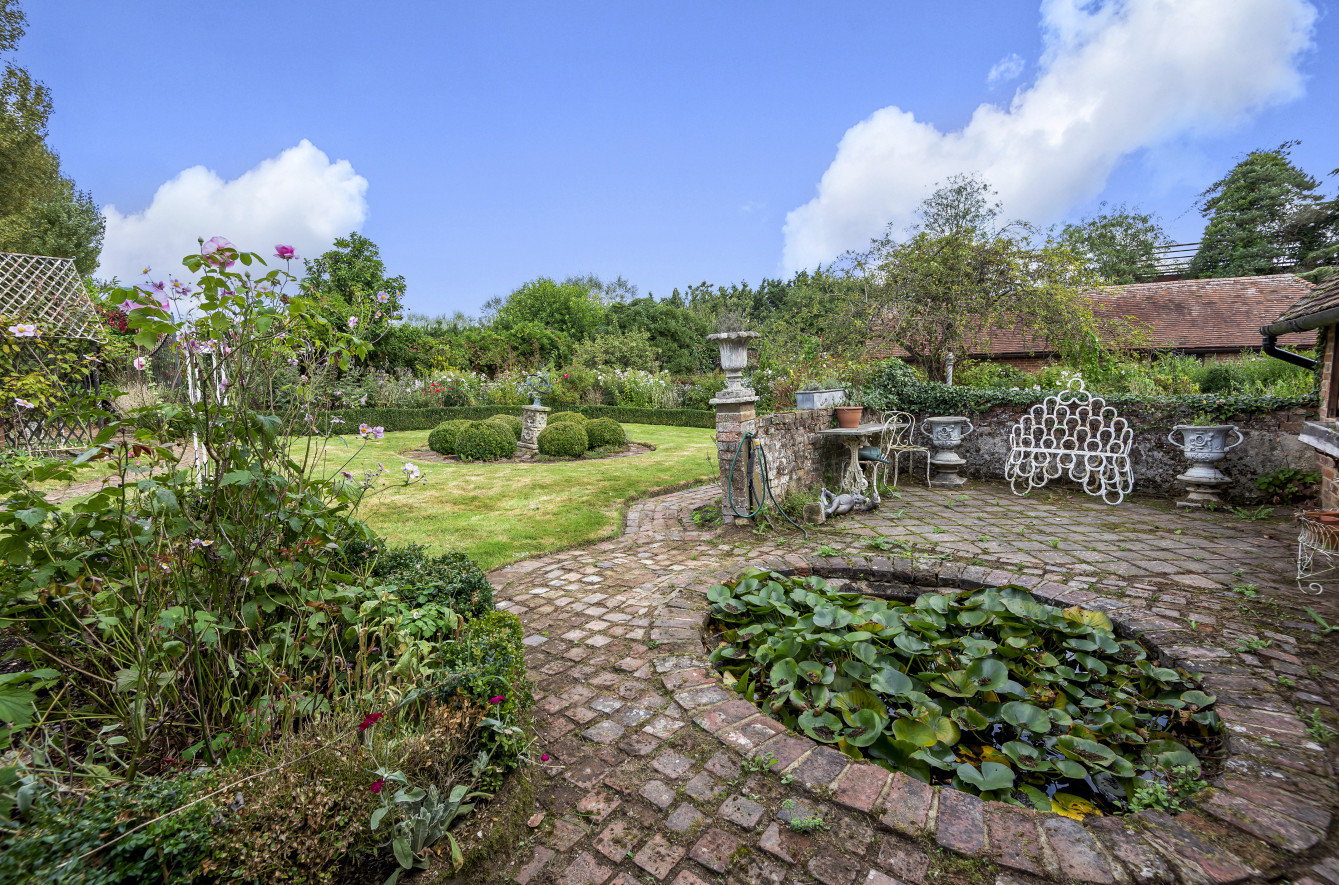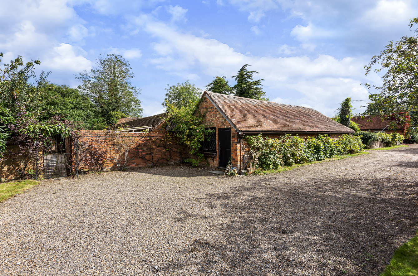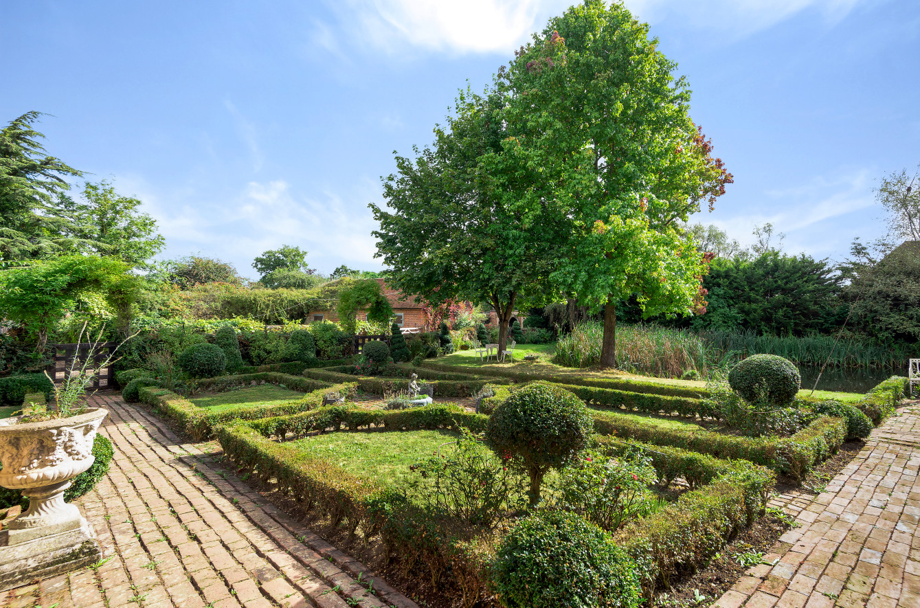 Great Old Hay is approached over an unmade, attractive Poplar tree lined driveway from Willow Lane leading up to a gravel parking area with double wrought iron gates opening onto a further gravel, part walled drive. The formal, landscaped gardens comprise ‘gardens within gardens’ with ornate brick pathways bordered by box and Yew hedging, a feature pond, an avenue of lime trees with Yew hedging, a detached brick garden implement store and a brick paved seating area.