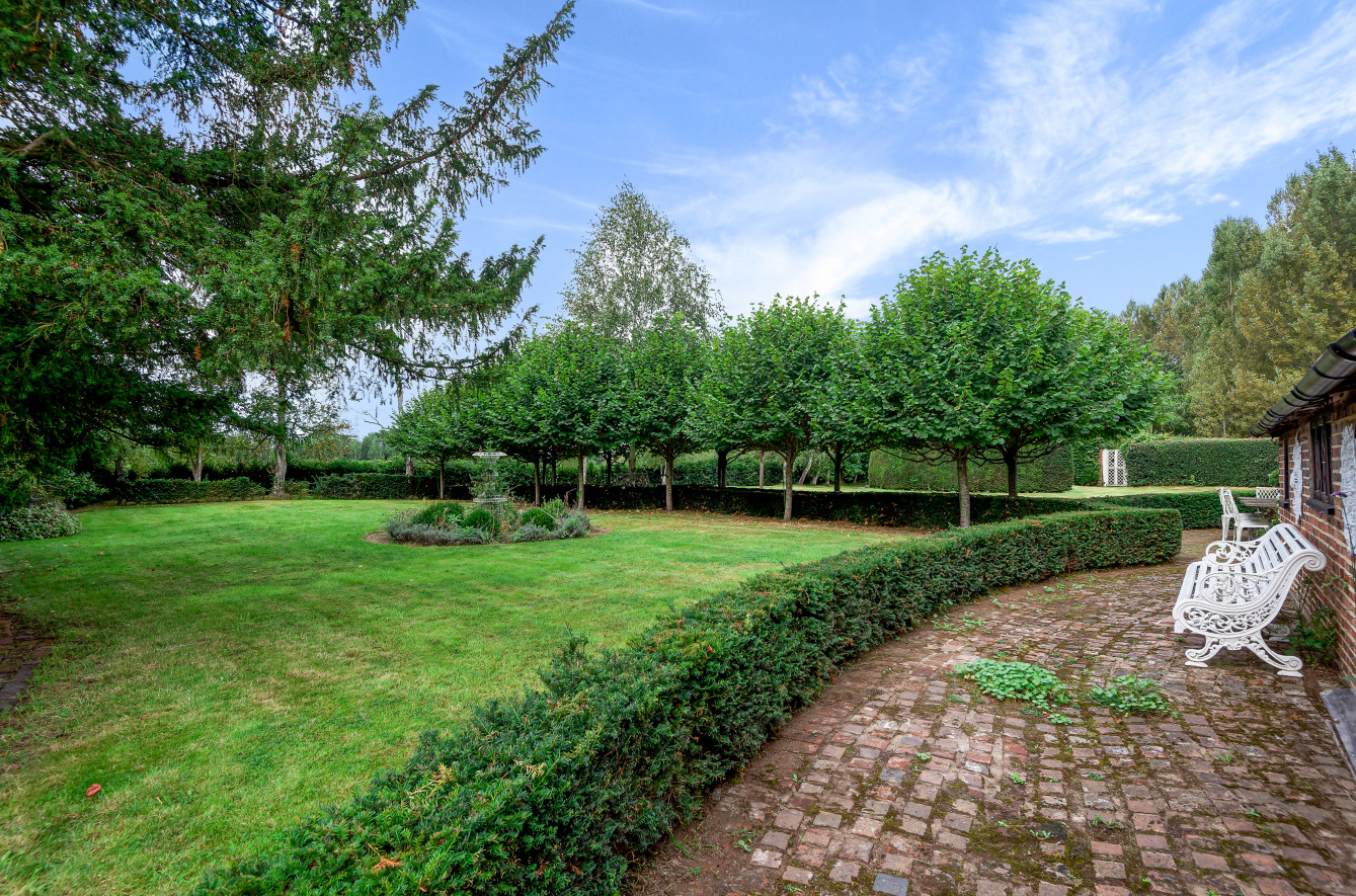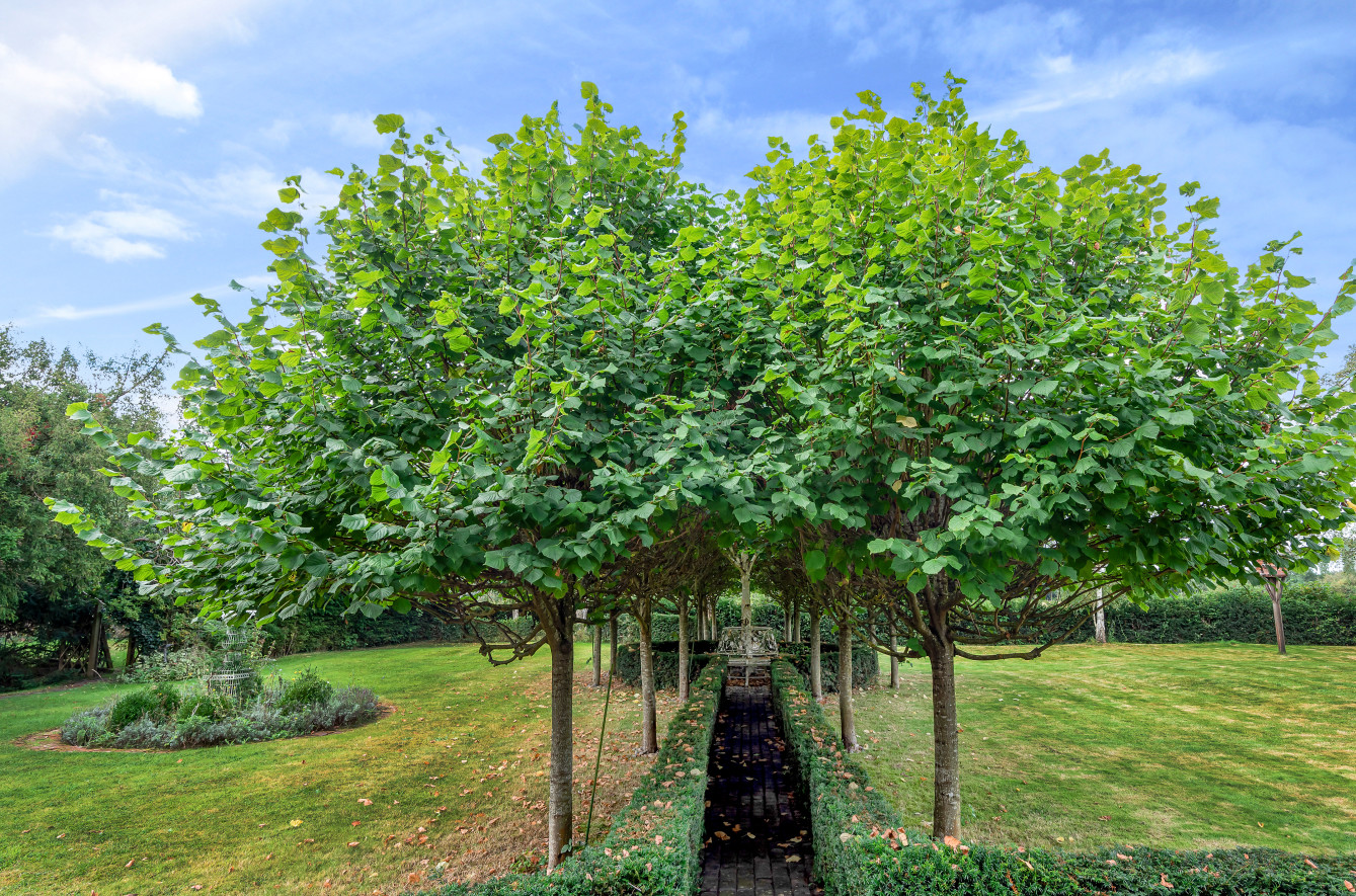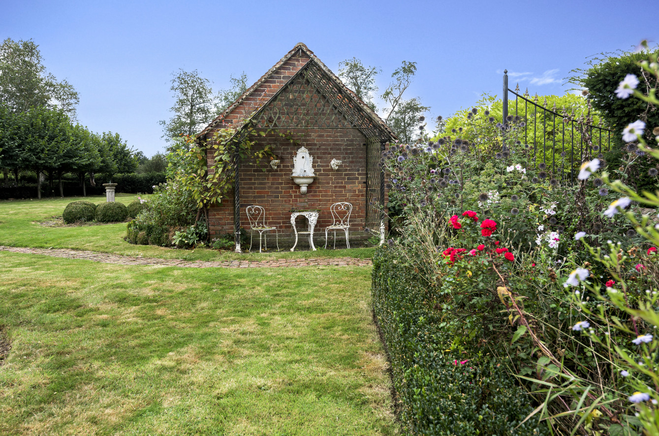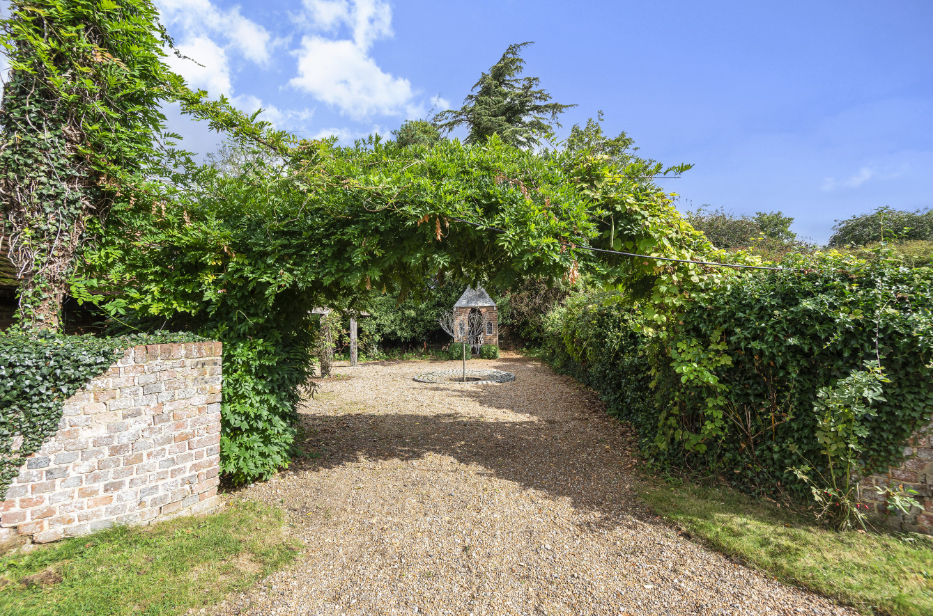 Great Old Hay is approached over an unmade, attractive Poplar tree lined driveway from Willow Lane leading up to a gravel parking area with double wrought iron gates opening onto a further gravel, part walled drive. The formal, landscaped gardens comprise ‘gardens within gardens’ with ornate brick pathways bordered by box and Yew hedging, a feature pond, an avenue of lime trees with Yew hedging, a detached brick garden implement store and a brick paved seating area.