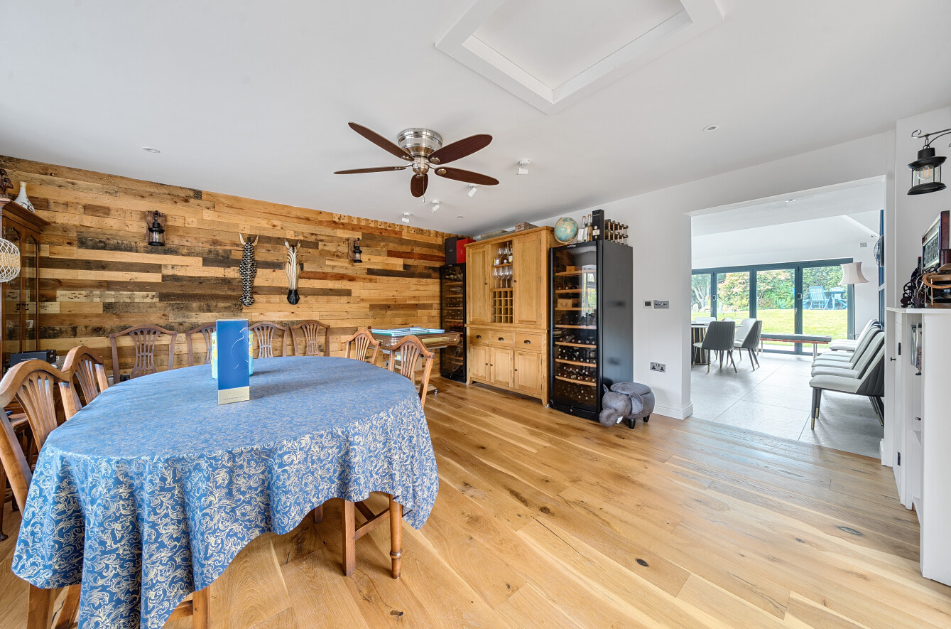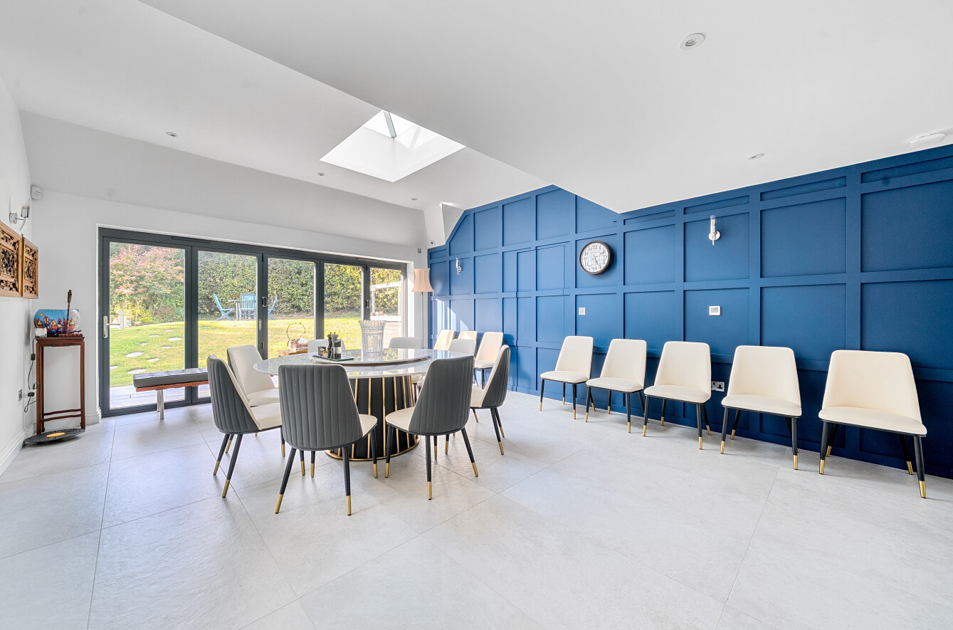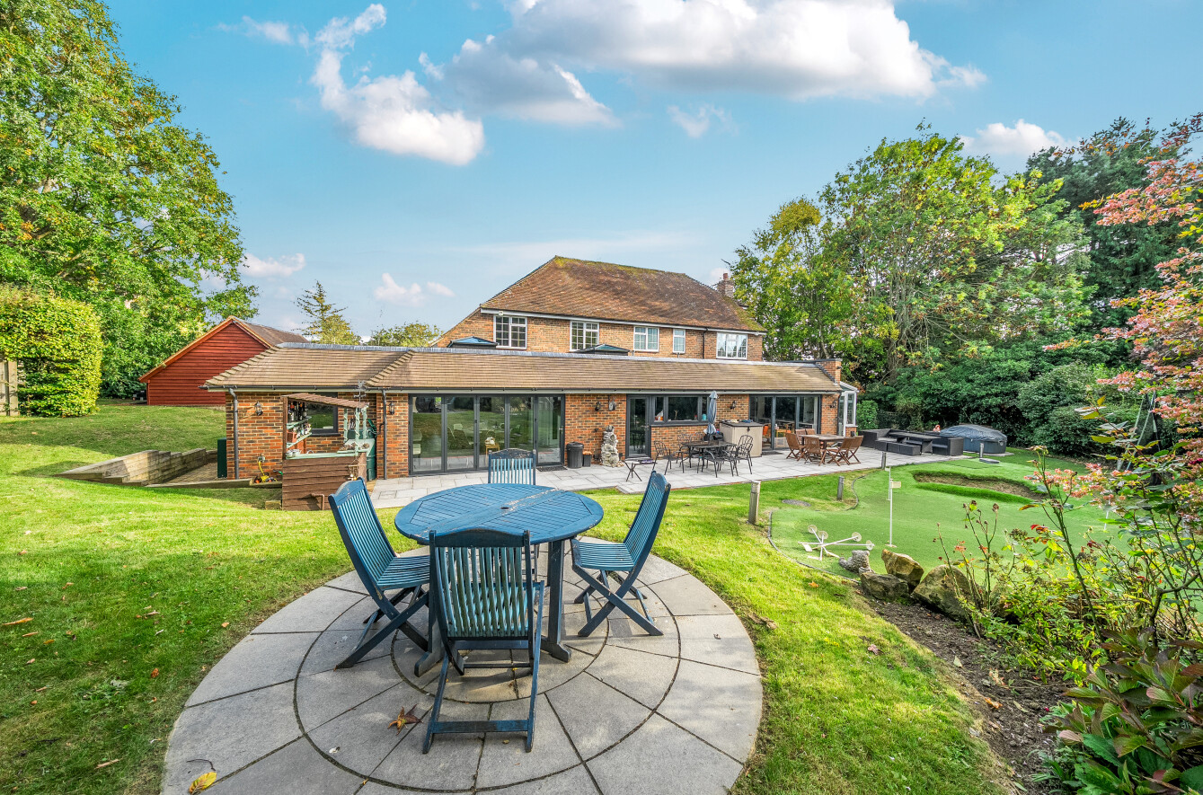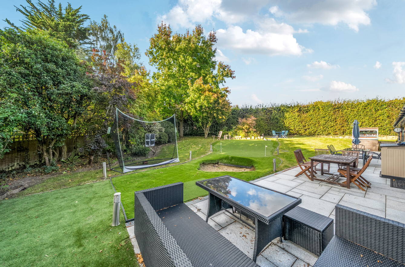 The home benefits from a significant single storey extension bringing natural light into the property from the skylights and two sets of bi-fold doors which all lead to a generous patio, outdoor bar area, a golf pitch and putt with sand bunker and garden laid to lawn with mature borders provide privacy and seclusion.