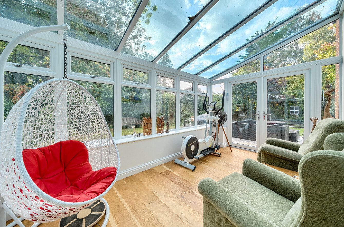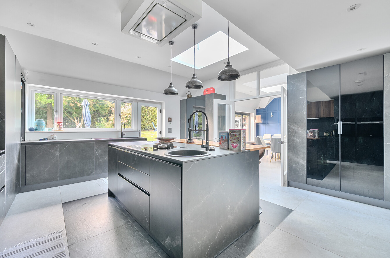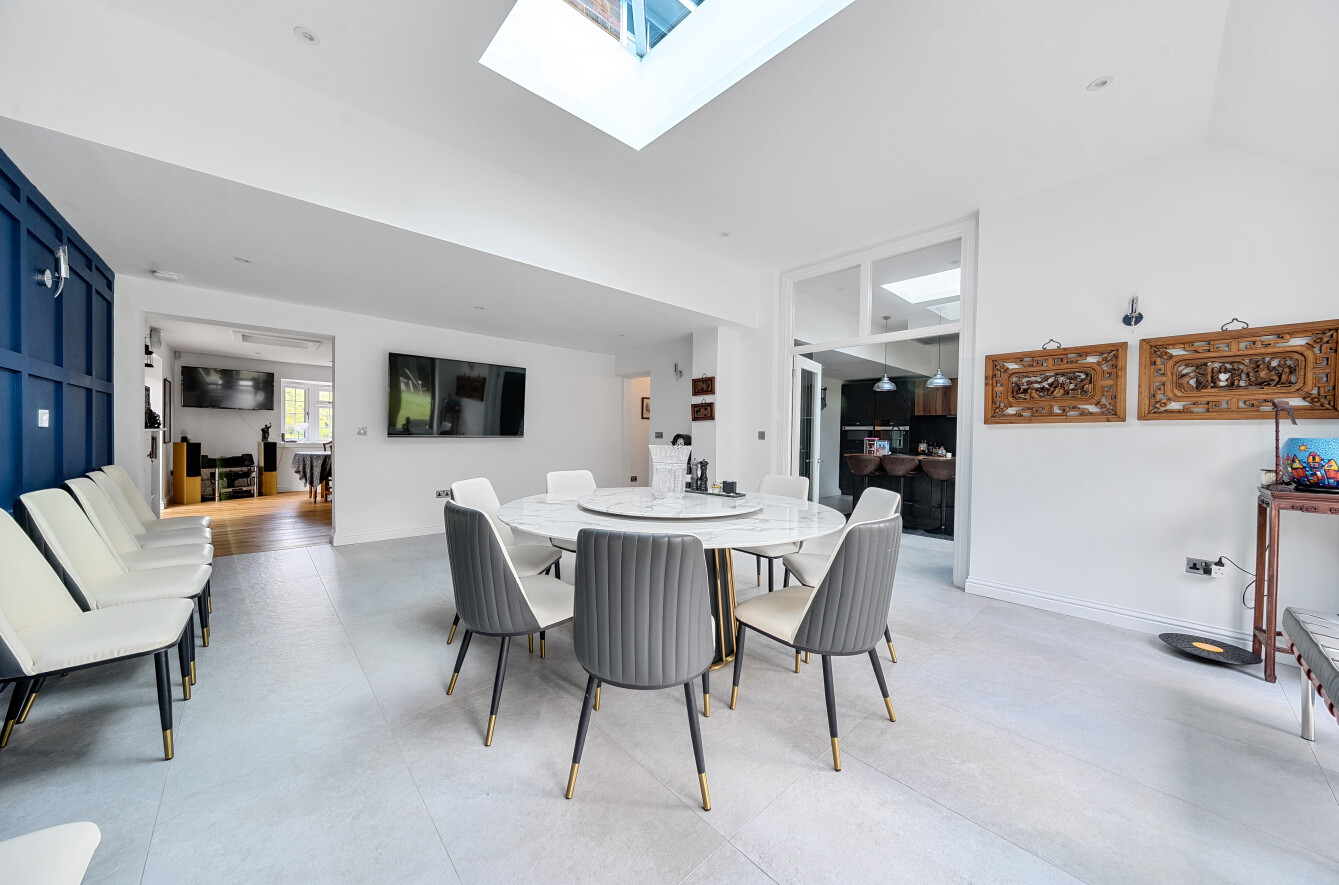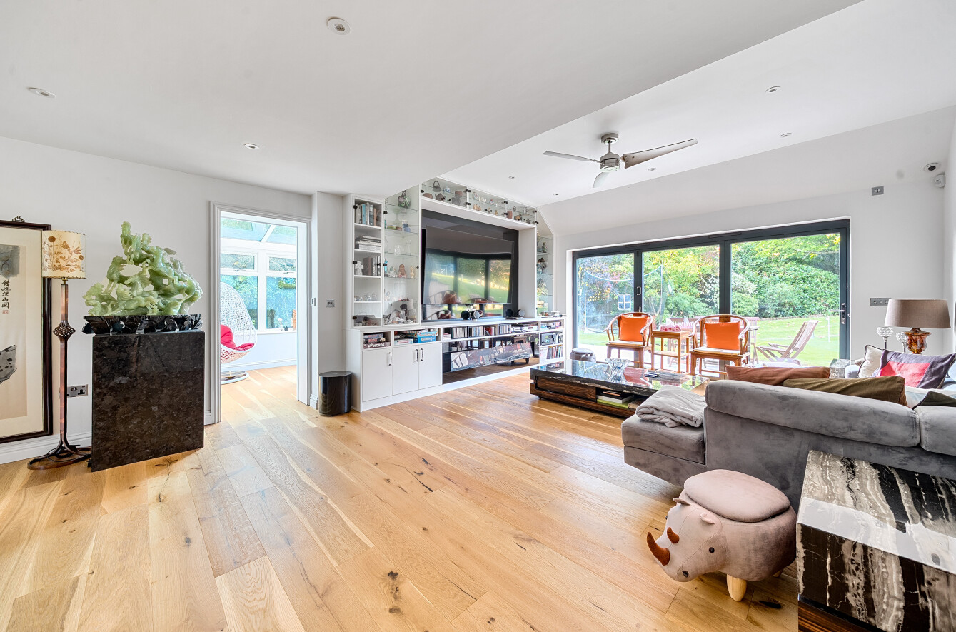 The home benefits from a significant single storey extension bringing natural light into the property from the skylights and two sets of bi-fold doors which all lead to a generous patio, outdoor bar area, a golf pitch and putt with sand bunker and garden laid to lawn with mature borders provide privacy and seclusion.