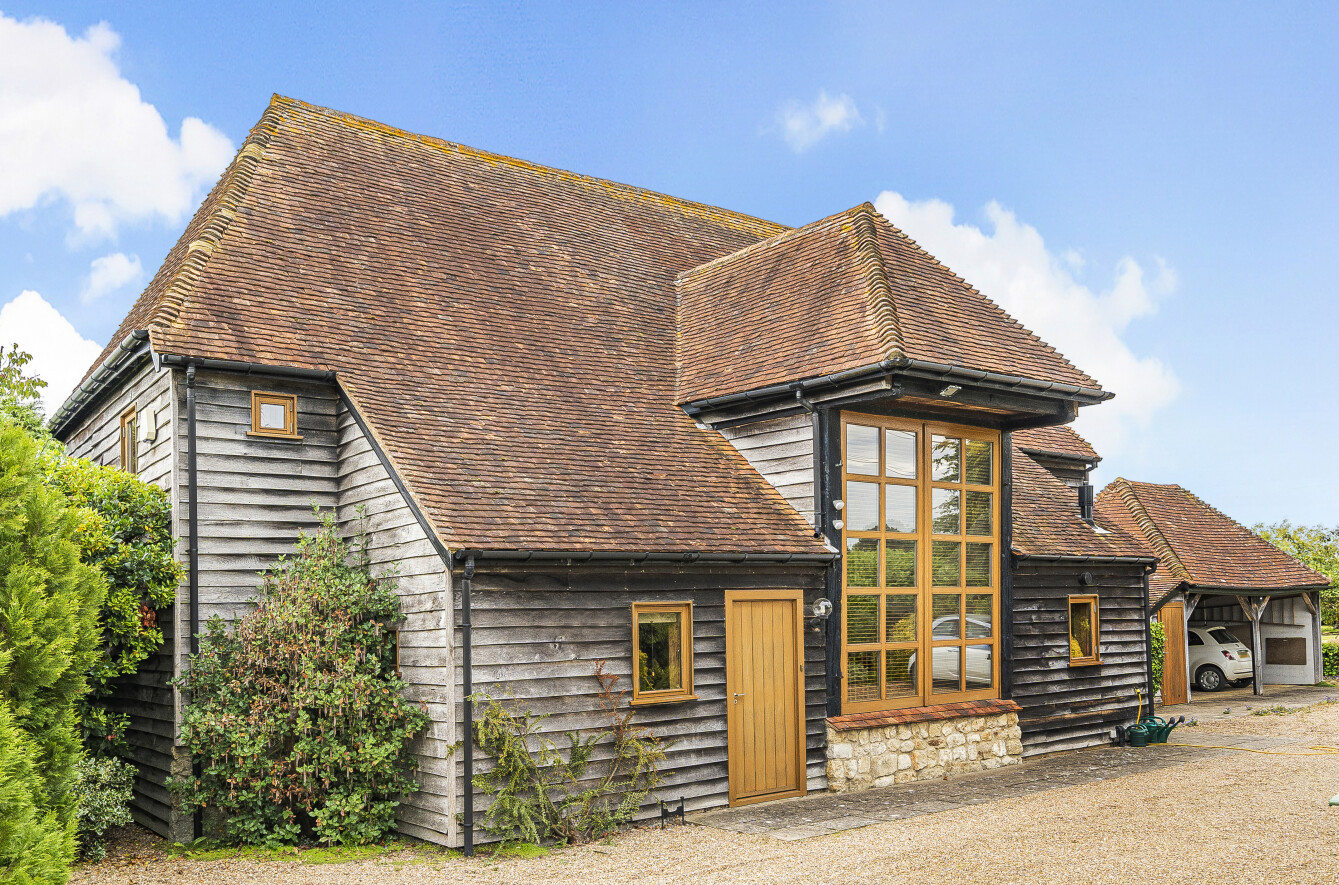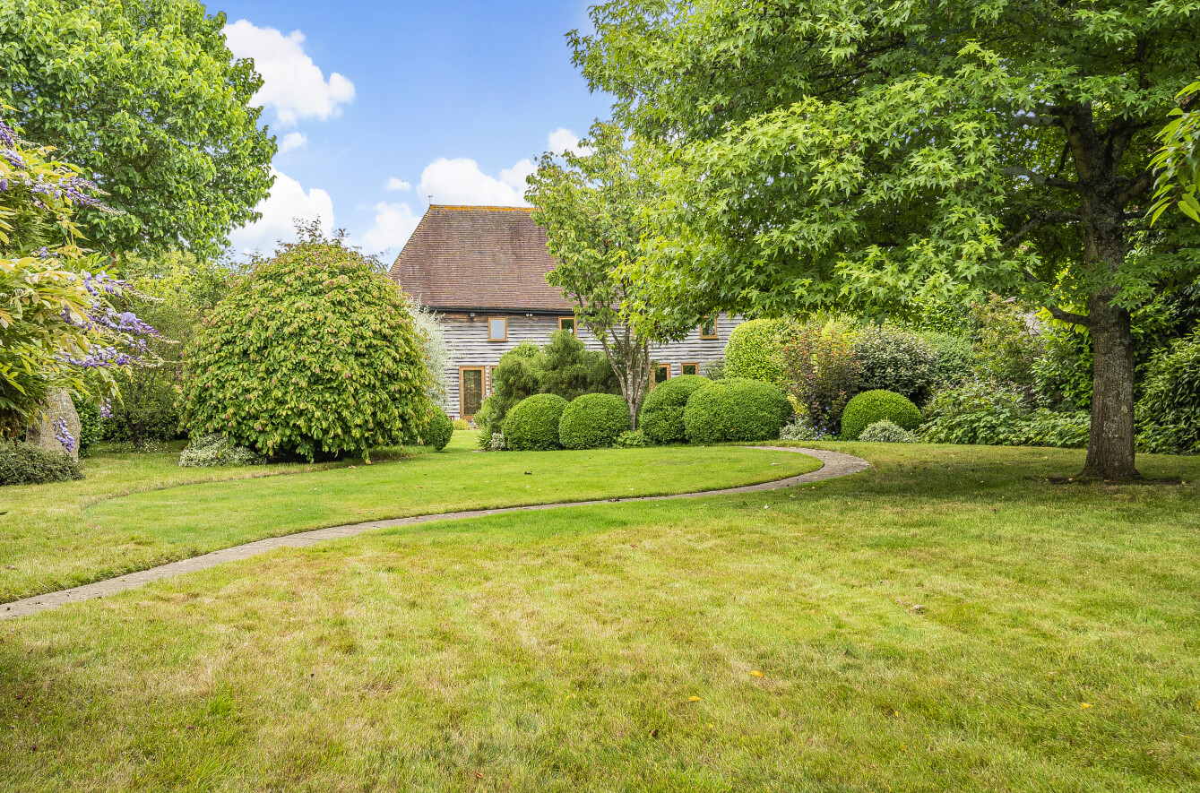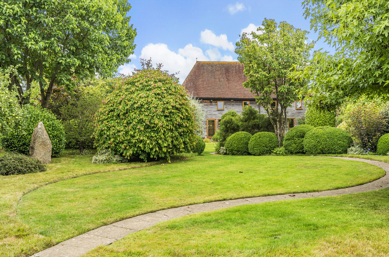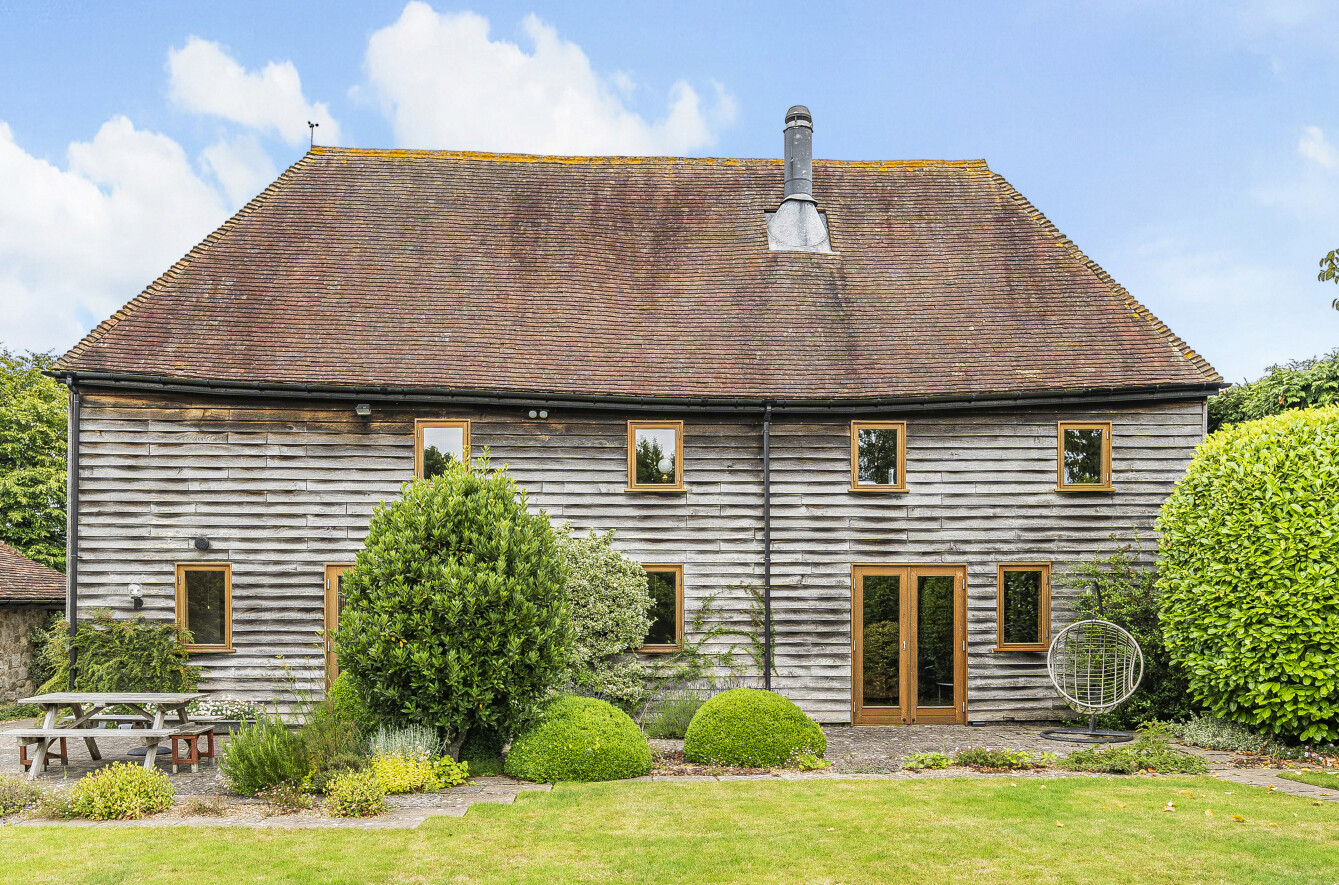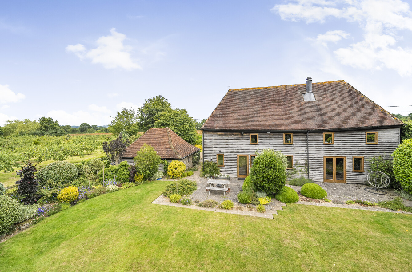 This charming grade II listed, circa mid 1600s detached Kentish barn occupies a semi-rural farm hamlet surrounded by beautiful Kent countryside a short distance from the pretty village of Marden. The barn was converted to an exacting standard 1987/1988, in good order throughout with character features including exposed beams, vaulted ceilings and is arranged over two floors. The barn sits in grounds of 1.56 acres (tbv) including formal gardens. Within the garden are two bespoke ornamental buildings. Adjoining the formal gardens is a traditional orchard with old English varieties. together with a detached open fronted twin bay cart lodge, with an enclosed, secure storage shed alongside, ideal for keeping garden implements. The whole occupies a favorable semi-rural location, adjoining and overlooking fields and countryside.