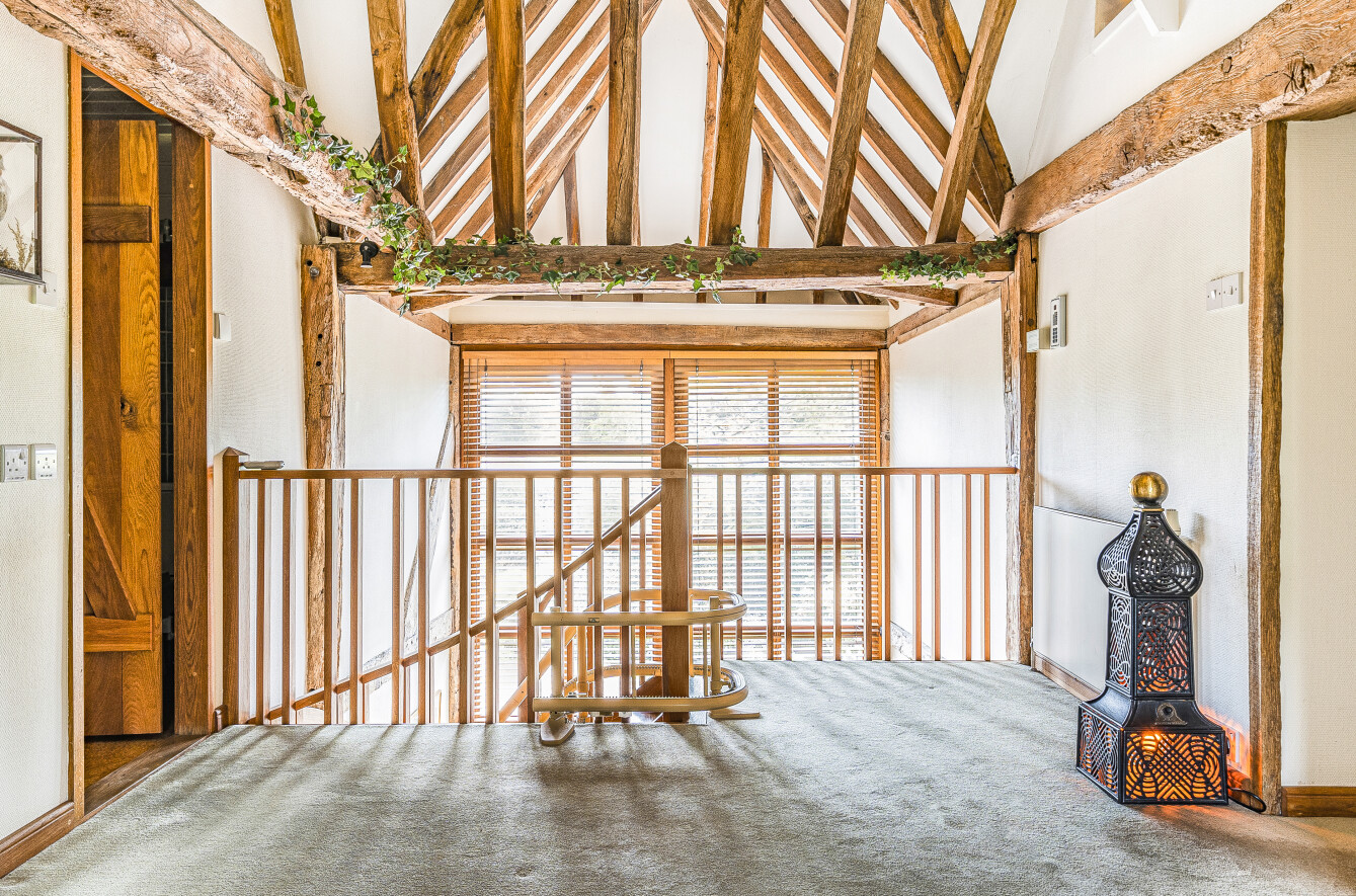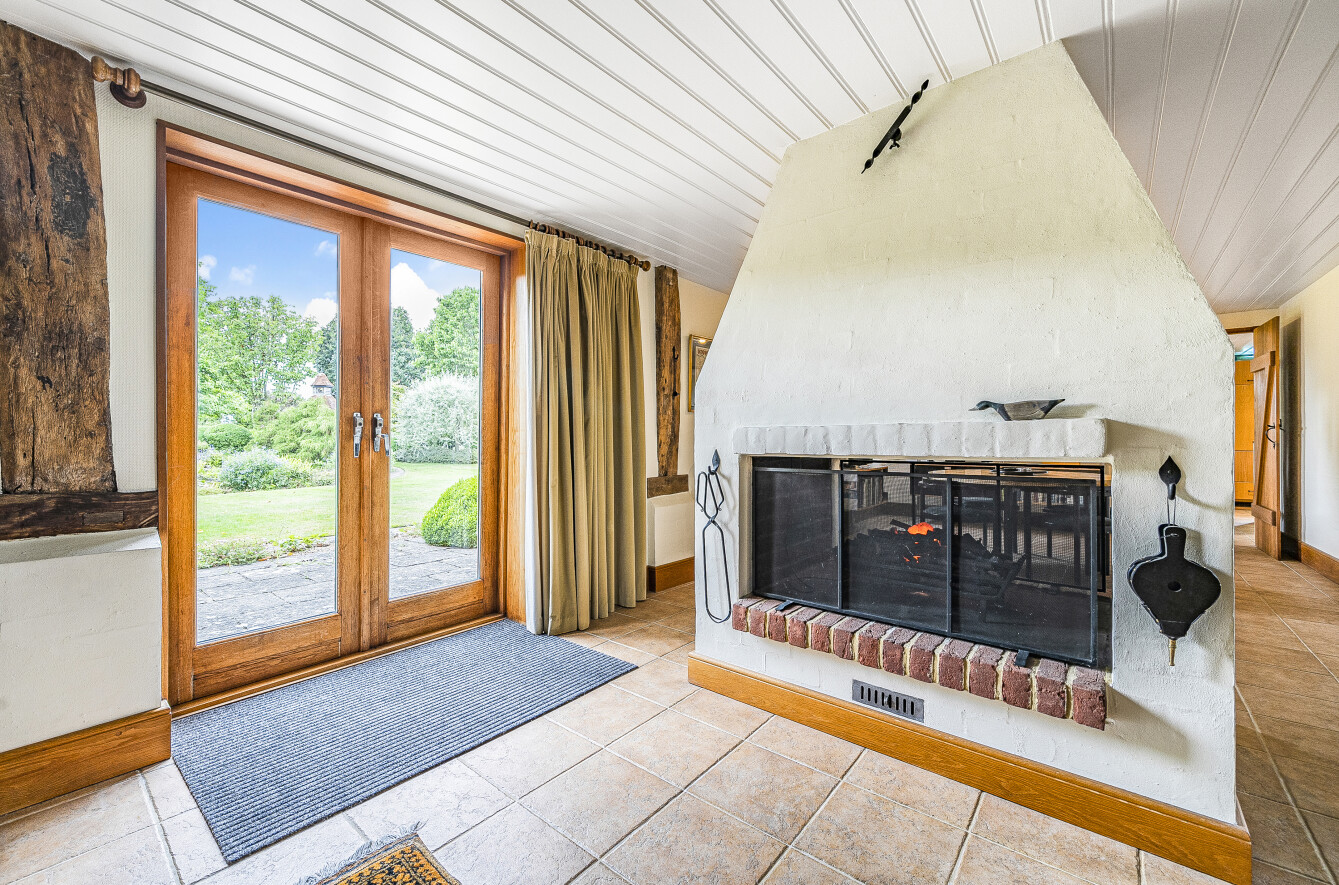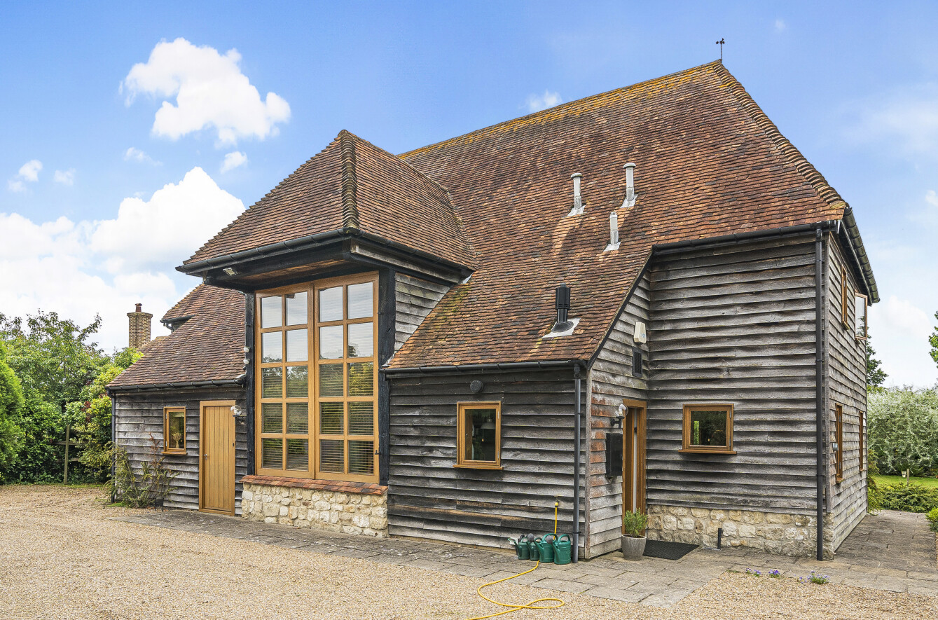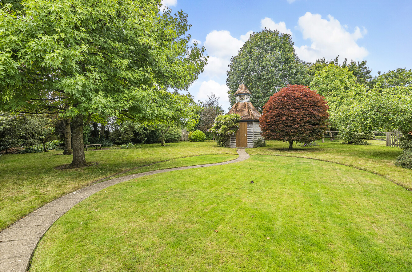 This charming grade II listed, circa mid 1600s detached Kentish barn occupies a semi-rural farm hamlet surrounded by beautiful Kent countryside a short distance from the pretty village of Marden. The barn was converted to an exacting standard 1987/1988, in good order throughout with character features including exposed beams, vaulted ceilings and is arranged over two floors. The barn sits in grounds of 1.56 acres (tbv) including formal gardens. Within the garden are two bespoke ornamental buildings. Adjoining the formal gardens is a traditional orchard with old English varieties. together with a detached open fronted twin bay cart lodge, with an enclosed, secure storage shed alongside, ideal for keeping garden implements. The whole occupies a favorable semi-rural location, adjoining and overlooking fields and countryside.