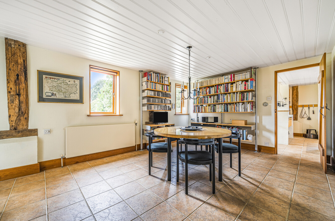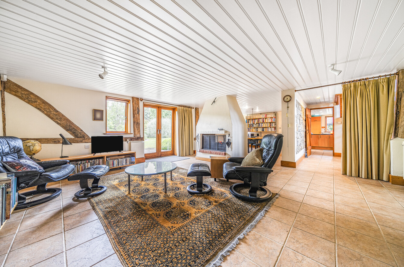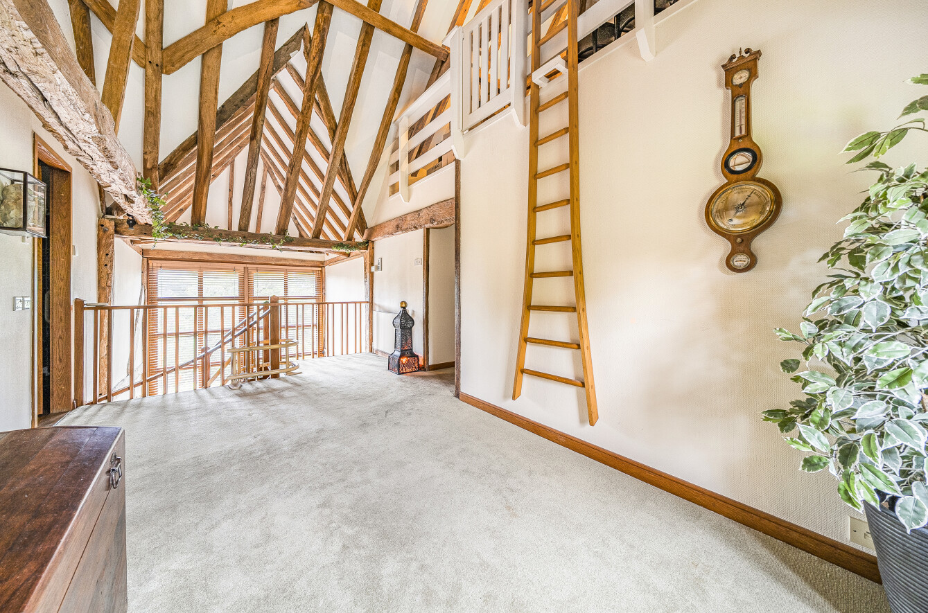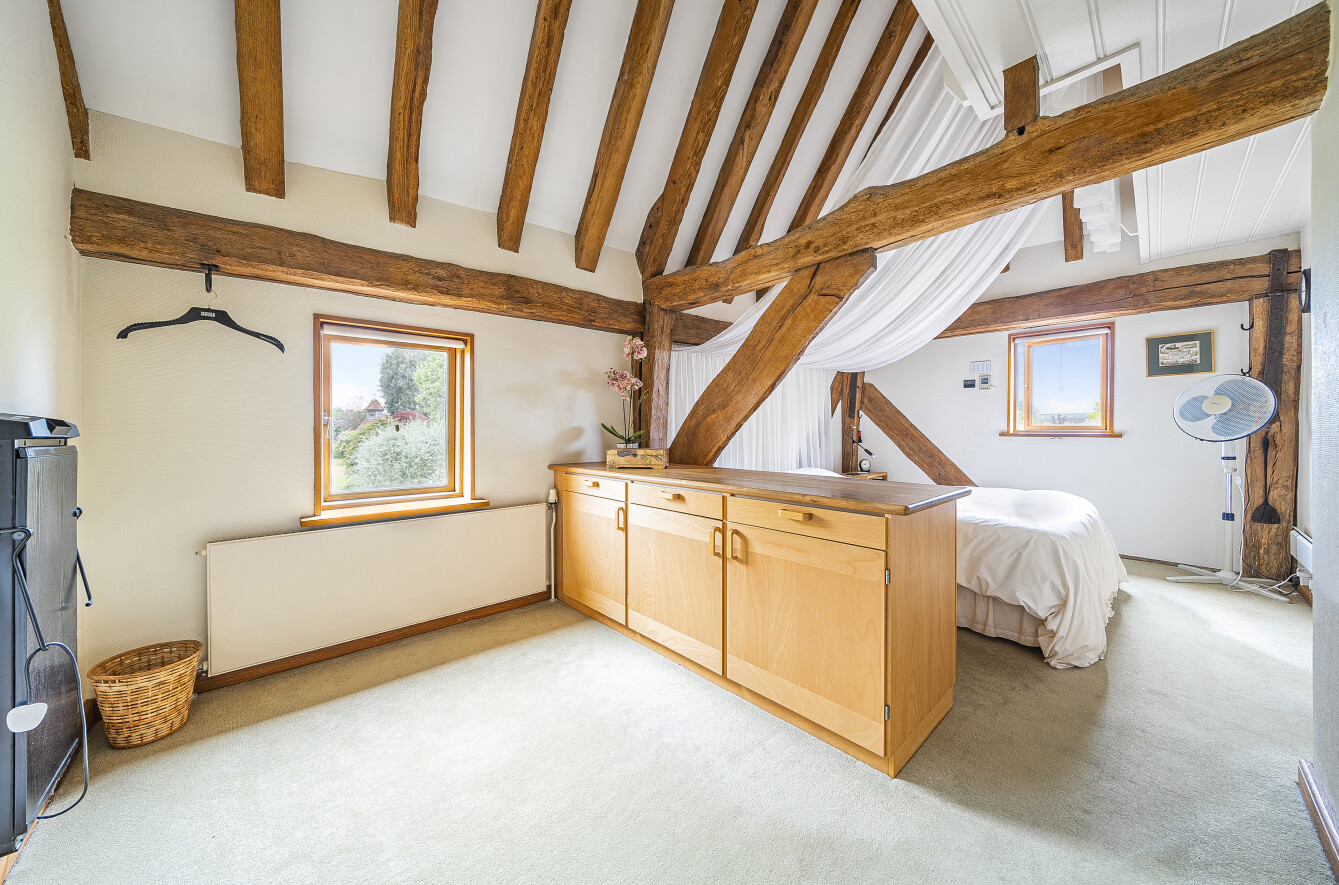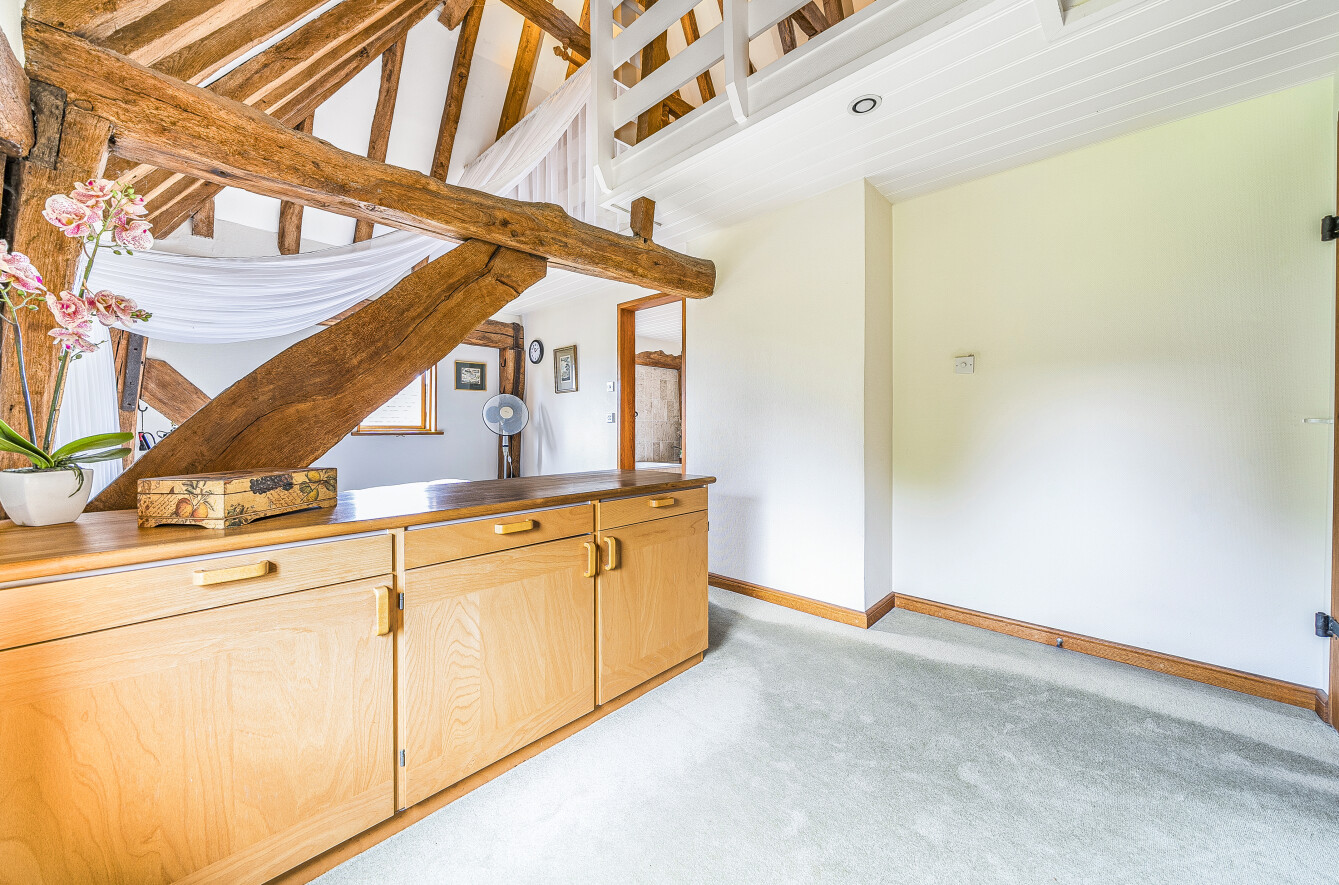 This charming grade II listed, circa mid 1600s detached Kentish barn occupies a semi-rural farm hamlet surrounded by beautiful Kent countryside a short distance from the pretty village of Marden. The barn was converted to an exacting standard 1987/1988, in good order throughout with character features including exposed beams, vaulted ceilings and is arranged over two floors. The barn sits in grounds of 1.56 acres (tbv) including formal gardens. Within the garden are two bespoke ornamental buildings. Adjoining the formal gardens is a traditional orchard with old English varieties. together with a detached open fronted twin bay cart lodge, with an enclosed, secure storage shed alongside, ideal for keeping garden implements. The whole occupies a favorable semi-rural location, adjoining and overlooking fields and countryside.