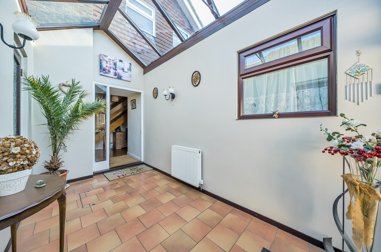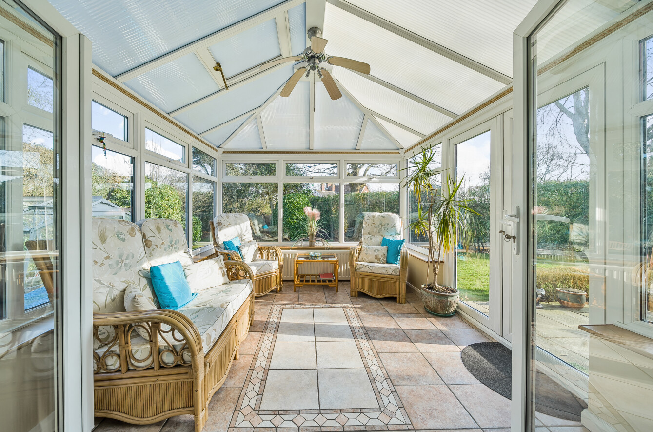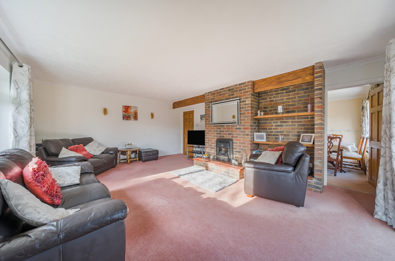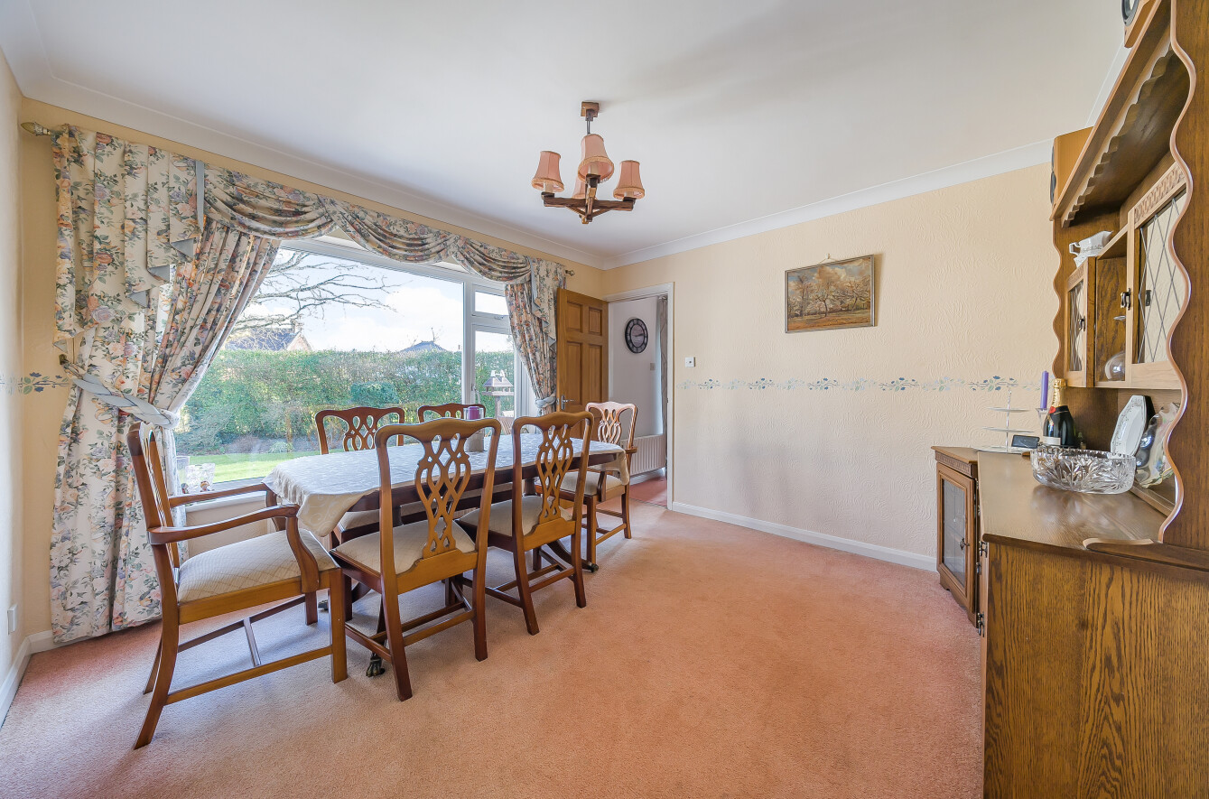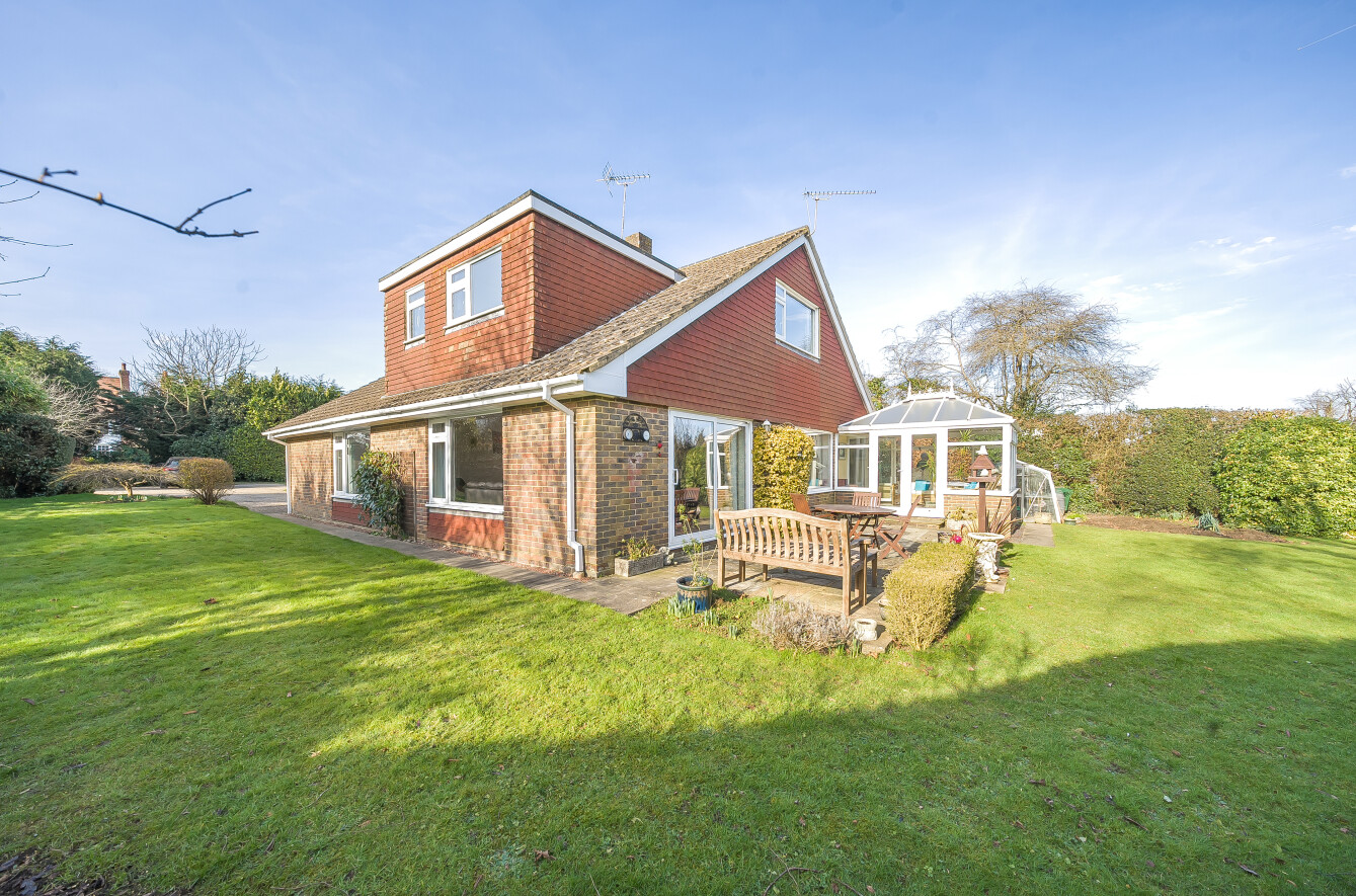 The Courtyard is an individual, detached chalet style family house, circa early 1970s presenting predominantly brick elevations with some tile hanging, set with UPVC double glazed windows, beneath a pitched tiled roof. The accommodation over time has been extended, altered and improved creating and well proportioned, flexible family home, now offering scope for updating of the interior fixtures and fittings if so desired. Features include a reception hall with a pitched glazed roof leading to an inner hall with doors leading off to a double aspect sitting room with brick fireplace and display shelving, housing a coal effect gas fire on a raised tiled hearth. Traditional parquet flooring extends to the hall, sitting room and dining room under existing carpet in some areas. A separate dining room has an aspect to rear across the garden. A fitted kitchen/breakfast room has some integral appliances including Belling double oven, grill and dishwasher, one and a half bowl sink unit with mixer tap over and a tiled floor. Double doors lead to the conservatory set on a dwarf brick wall with UPVC windows and panels, fitted with light and heating, double doors opening out onto the garden. The inner hall doors lead off to ground floor bedroom three and bedroom four, comprising a double and single room, fitted wardrobes, served by family bathroom one, fitted with a white suite including a bath with integrated shower. Bed/sitting room five accessed from the reception hall includes a kitchenette area and has an en suite shower room.