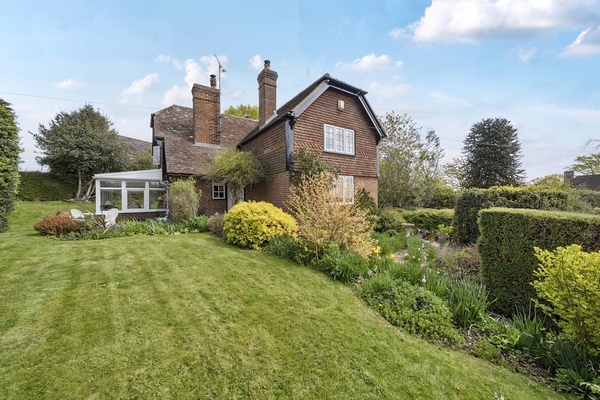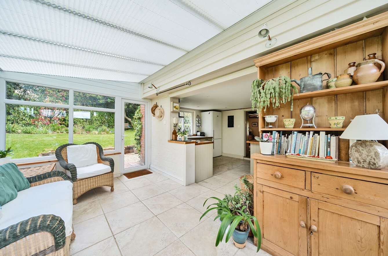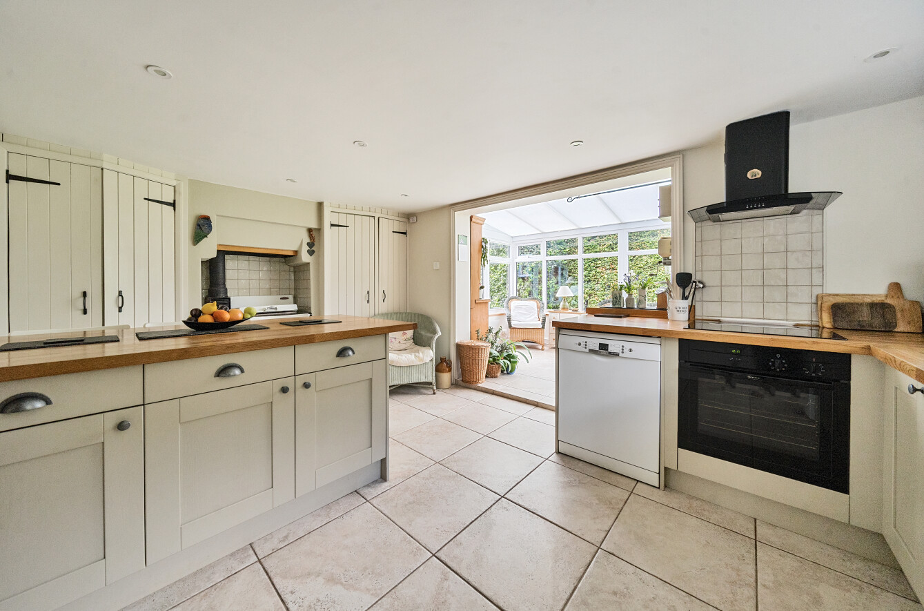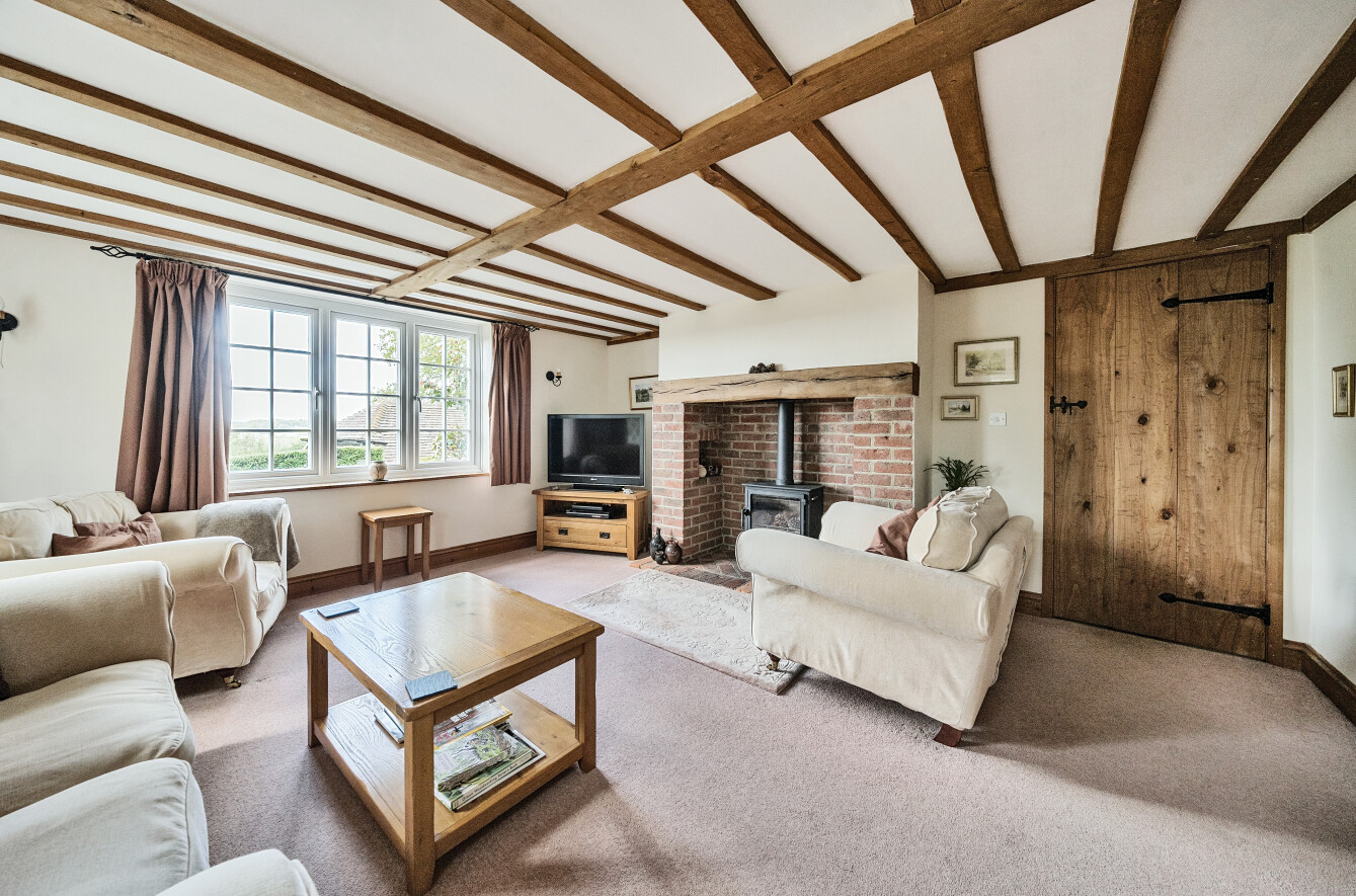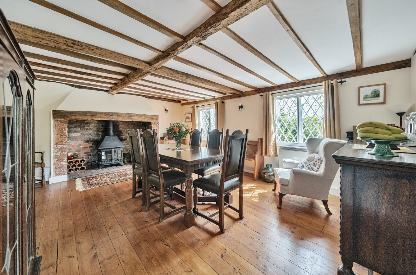 King Charles is a character, unlisted cottage, with origins dating back to circa 1700s with a significant, two storey extension added in the late 1990’s. The cottage presents elevations of brick and tile hanging, set with a mixture of sympathetic UPVC double glazed windows and secondary glazed leaded light windows, beneath a pitched and hipped tiled roof. The well presented accommodation is arranged over two floors with features including two separate reception rooms, incorporating a sitting room with inglenook style fireplace housing a wood burning stove, enjoying a double aspect, a separate dining room with inglenook fireplace housing a wood burning stove, oak bressummer beam, exposed floorboards and timbers to ceiling. The kitchen/breakfast room is fitted with base level units and three seater breakfast bar, integral appliances include ceramic Bosch hob with filter hood over and Neff electric fan assisted oven under, space and plumbing for washing machine and dishwasher, solid fuel Rayburn range providing domestic hot water, immediate heat and cooking facility, useful larder cupboard and space for upright fridge freezer. Open access leads to a conservatory comprising UPVC windows and panels, ceiling blinds, electric heater, enjoying a pleasant outlook across the garden.
