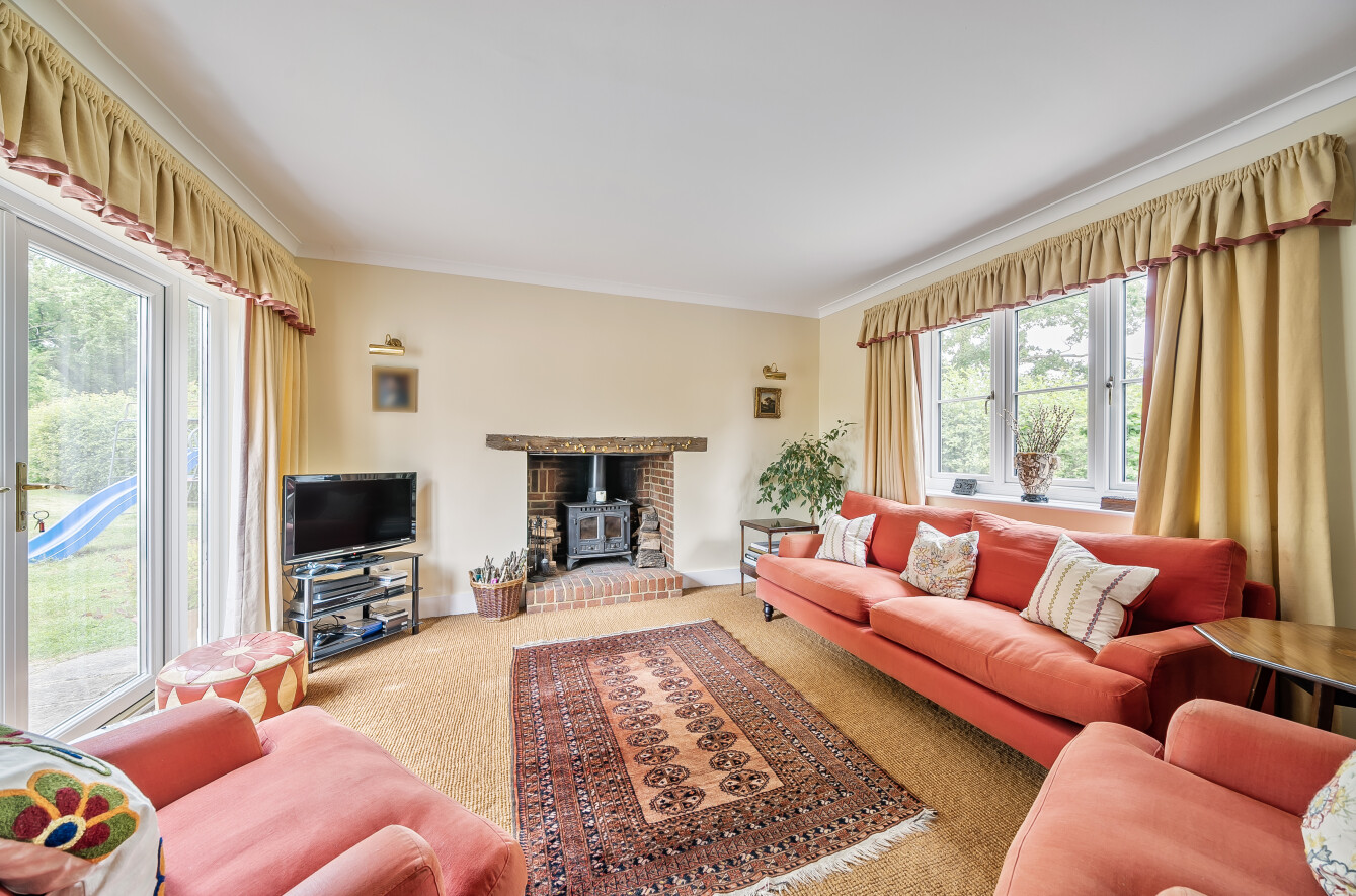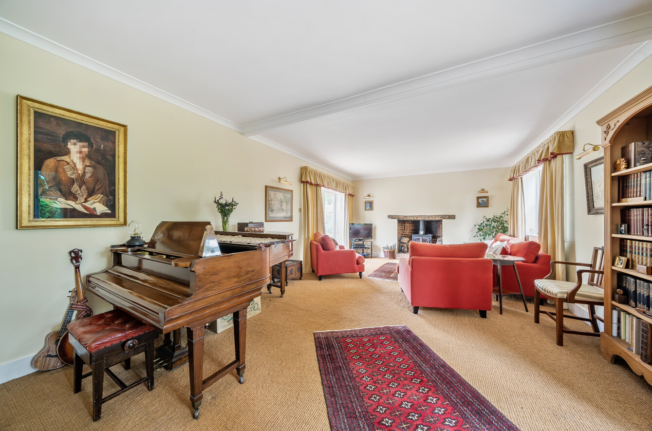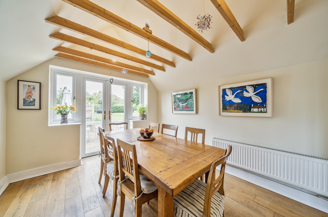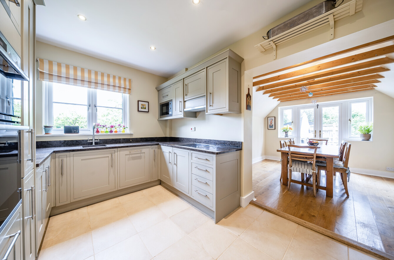 The house offers bright, well-balanced family living over two floors, with several double-aspect rooms and views over the gardens. A canopy porch leads to the front door and into a welcoming entrance hall running through the house, with doors to the main ground-floor rooms. To one side the large sunny sitting room centres around a fireplace with a wood-burning stove, a double aspect and double doors opening onto the patio and garden. Across the hall, the family room is another bright, double aspect space with a fireplace and fitted shelving. The spacious and bright kitchen is fitted with a range of units complemented by granite worktops and integrated appliances including an AEG electric hob, Bosch electric oven and grill, fridge/freezer, Bosch dishwasher and Electrolux microwave. There is also a stainless-steel sink, pull-out corner cupboards and a tiled floor. From the kitchen, the space flows into the open plan dining room with oak floorboards and double doors leading into the garden, making it ideal for summer dining and entertaining. The ground floor also includes a cloakroom and a practical utility room. From here, a stable door opens to the rear porch and the main garden beyond.