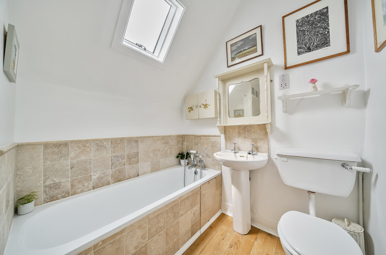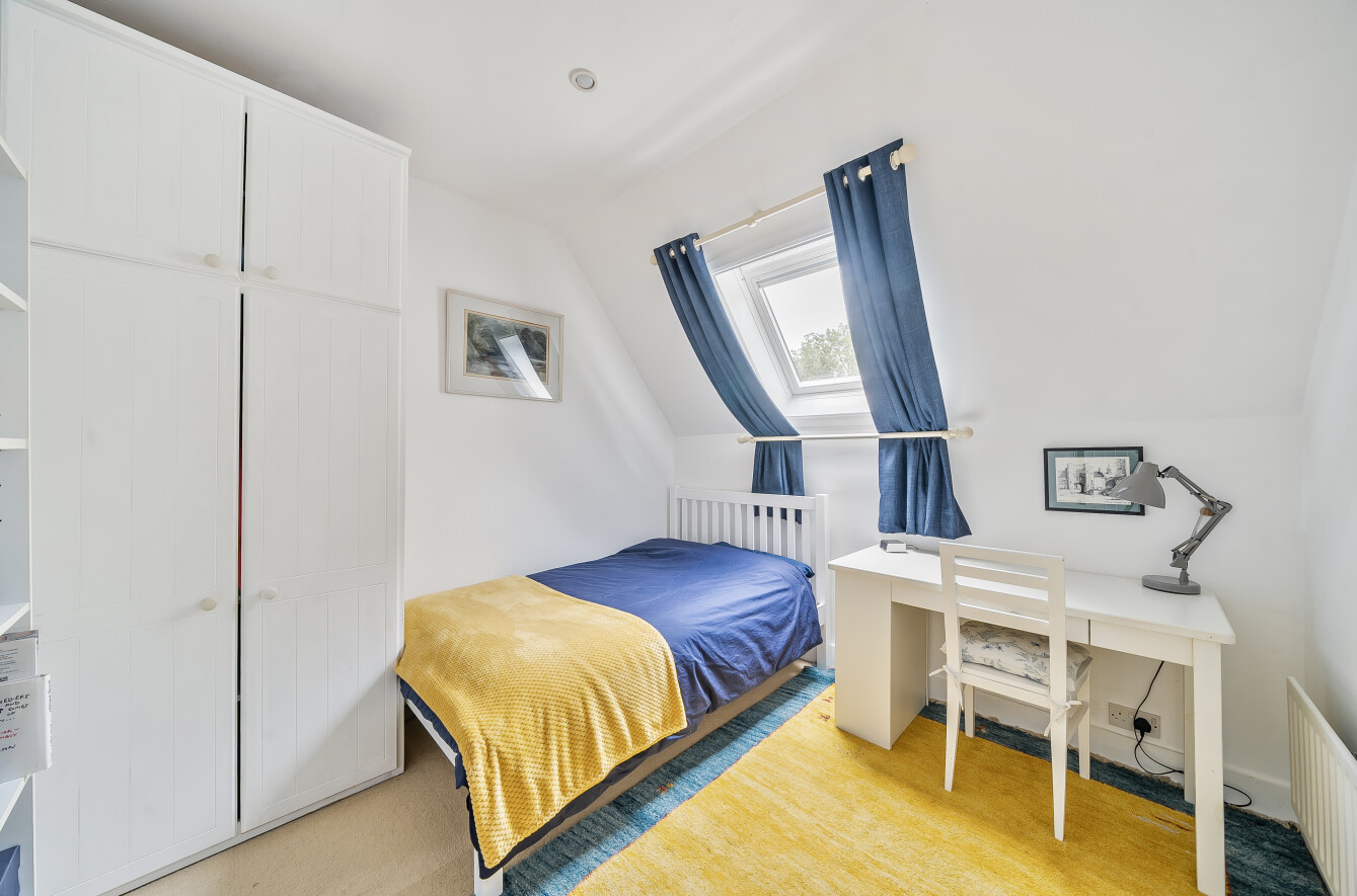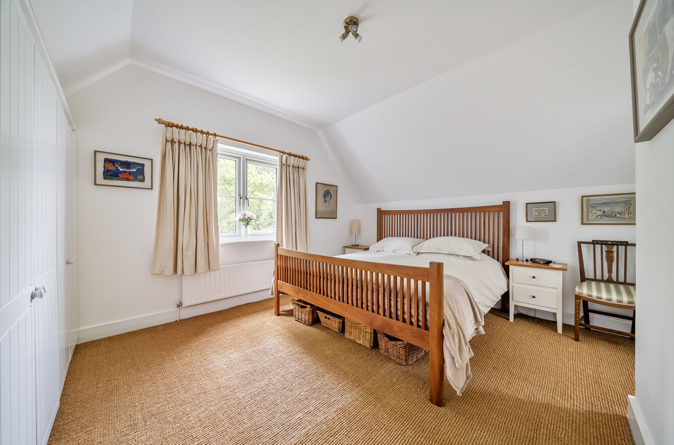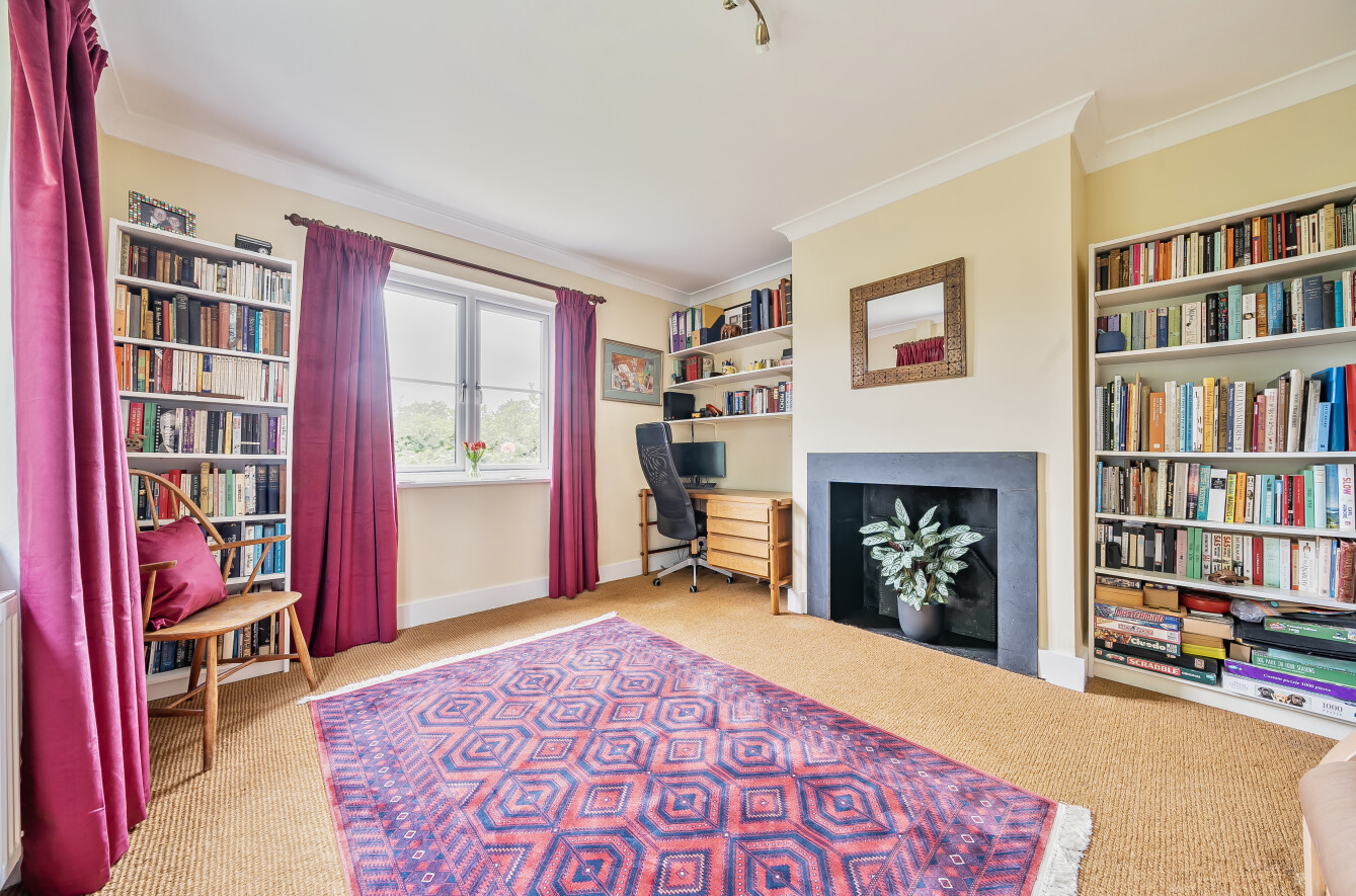 The house offers bright, well-balanced family living over two floors, with several double-aspect rooms and views over the gardens. A canopy porch leads to the front door and into a welcoming entrance hall running through the house, with doors to the main ground-floor rooms. To one side the large sunny sitting room centres around a fireplace with a wood-burning stove, a double aspect and double doors opening onto the patio and garden. Across the hall, the family room is another bright, double aspect space with a fireplace and fitted shelving. The spacious and bright kitchen is fitted with a range of units complemented by granite worktops and integrated appliances including an AEG electric hob, Bosch electric oven and grill, fridge/freezer, Bosch dishwasher and Electrolux microwave. There is also a stainless-steel sink, pull-out corner cupboards and a tiled floor. From the kitchen, the space flows into the open plan dining room with oak floorboards and double doors leading into the garden, making it ideal for summer dining and entertaining. The ground floor also includes a cloakroom and a practical utility room. From here, a stable door opens to the rear porch and the main garden beyond.