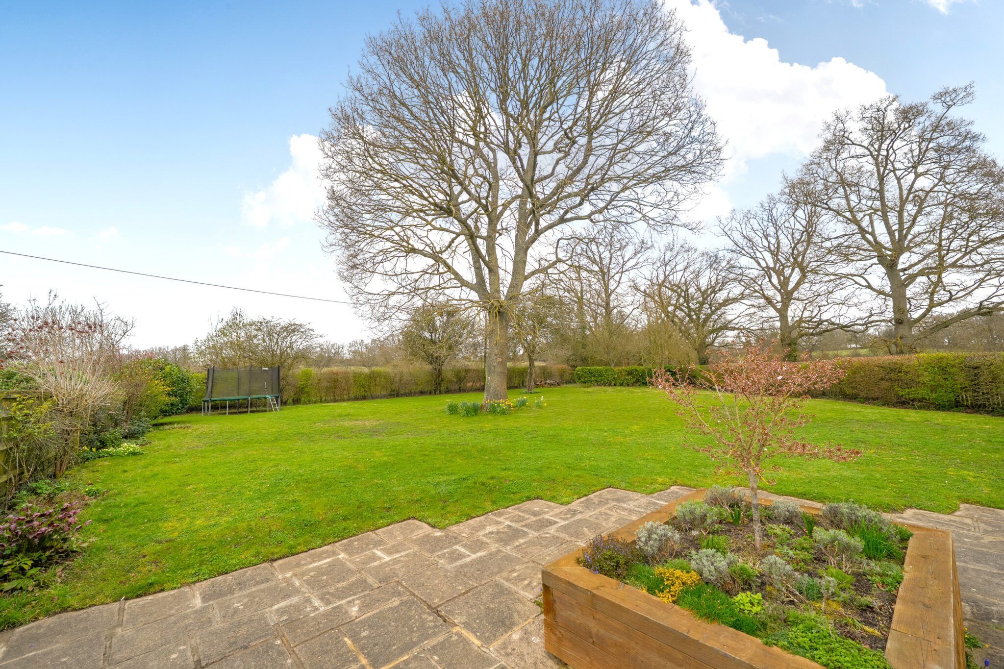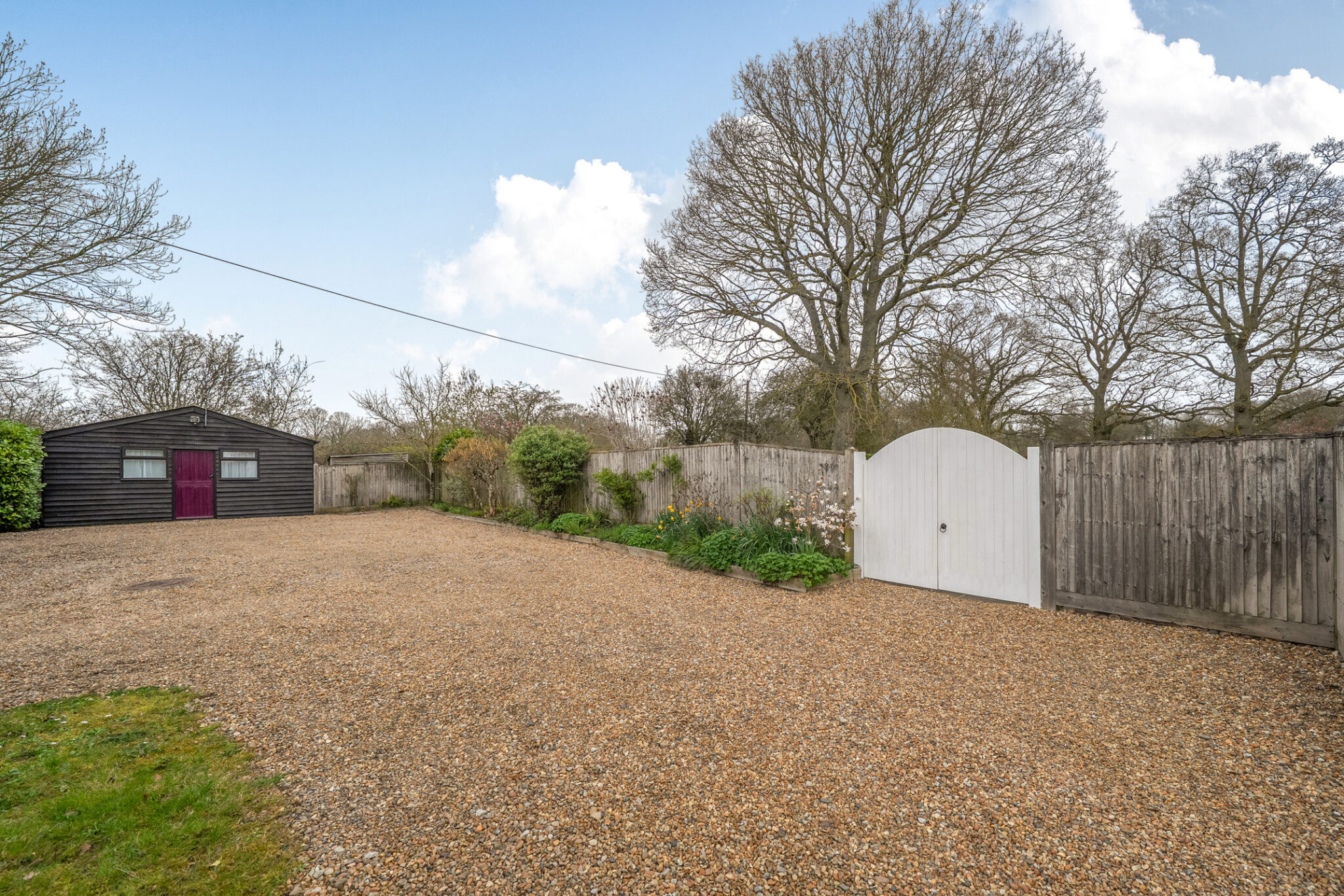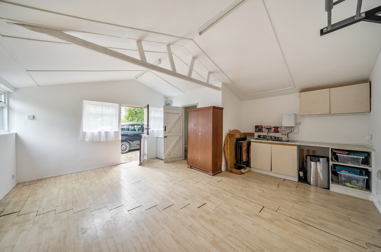 Outside, wooden gates open onto extensive parking, bordered in part by a mixed rose and flower bed. A detached timber outbuilding offers useful additional space with power, lighting, wall-mounted electric heater, WC and shower. It is considered that this building, subject to obtaining the necessary consents, provides a good footprint for a more substantial replacement double garage with office above. The garden is a particular feature, extending mainly to the rear and laid predominantly to lawn with a variety of established trees, shrubs and flower beds. A patio area with central raised bed, gravel path and rose garden provides an attractive space for outdoor dining and relaxing. The whole plot is enclosed by established hedging and extends to around half an acre.