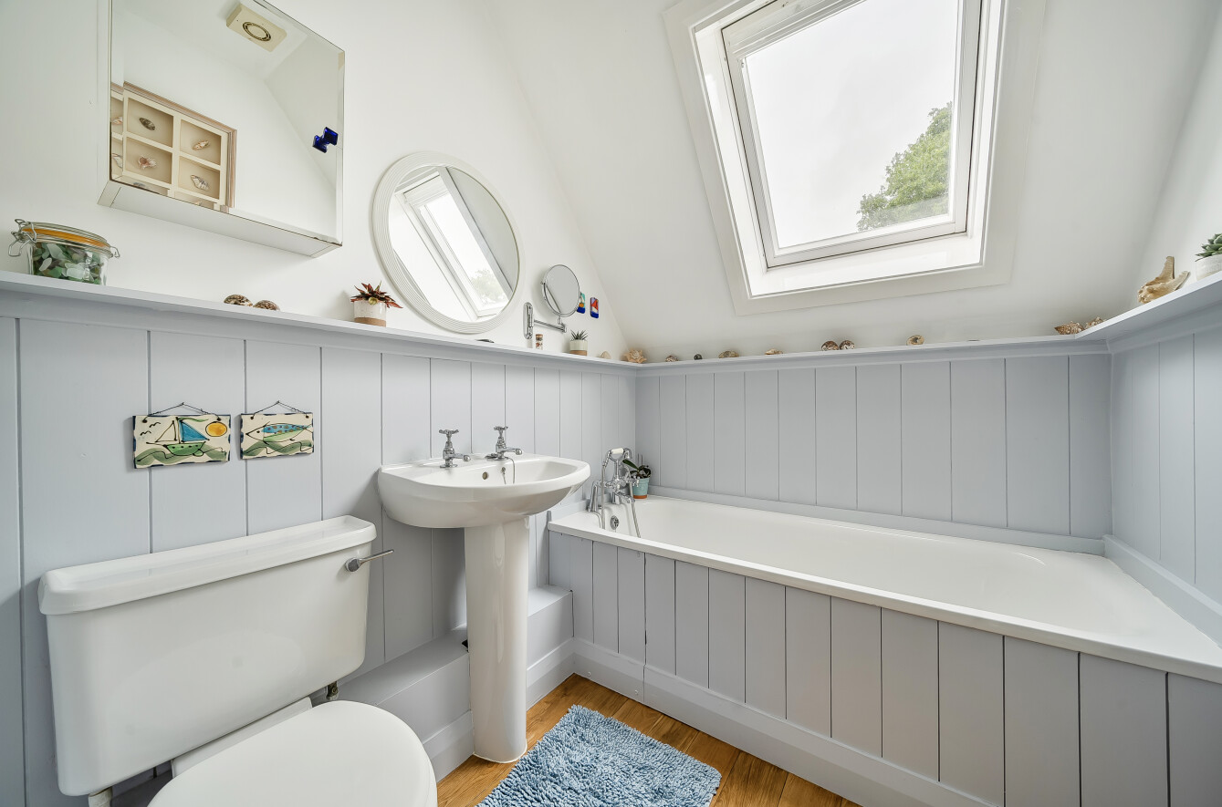On the first floor are four bedrooms, including the main bedroom with fitted wardrobes and an en suite bathroom. The remaining bedrooms include two double rooms and a single room, served by a family bathroom with bath and separate tiled shower.