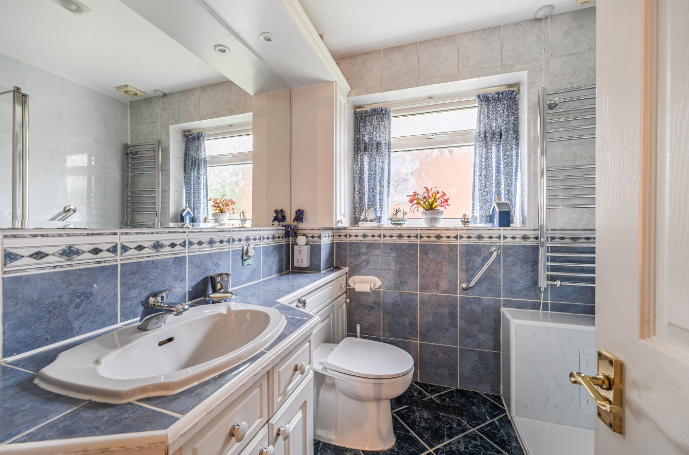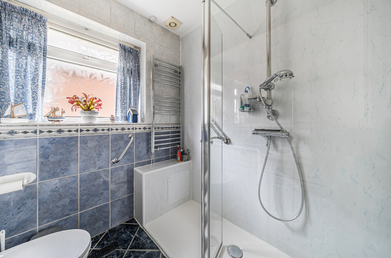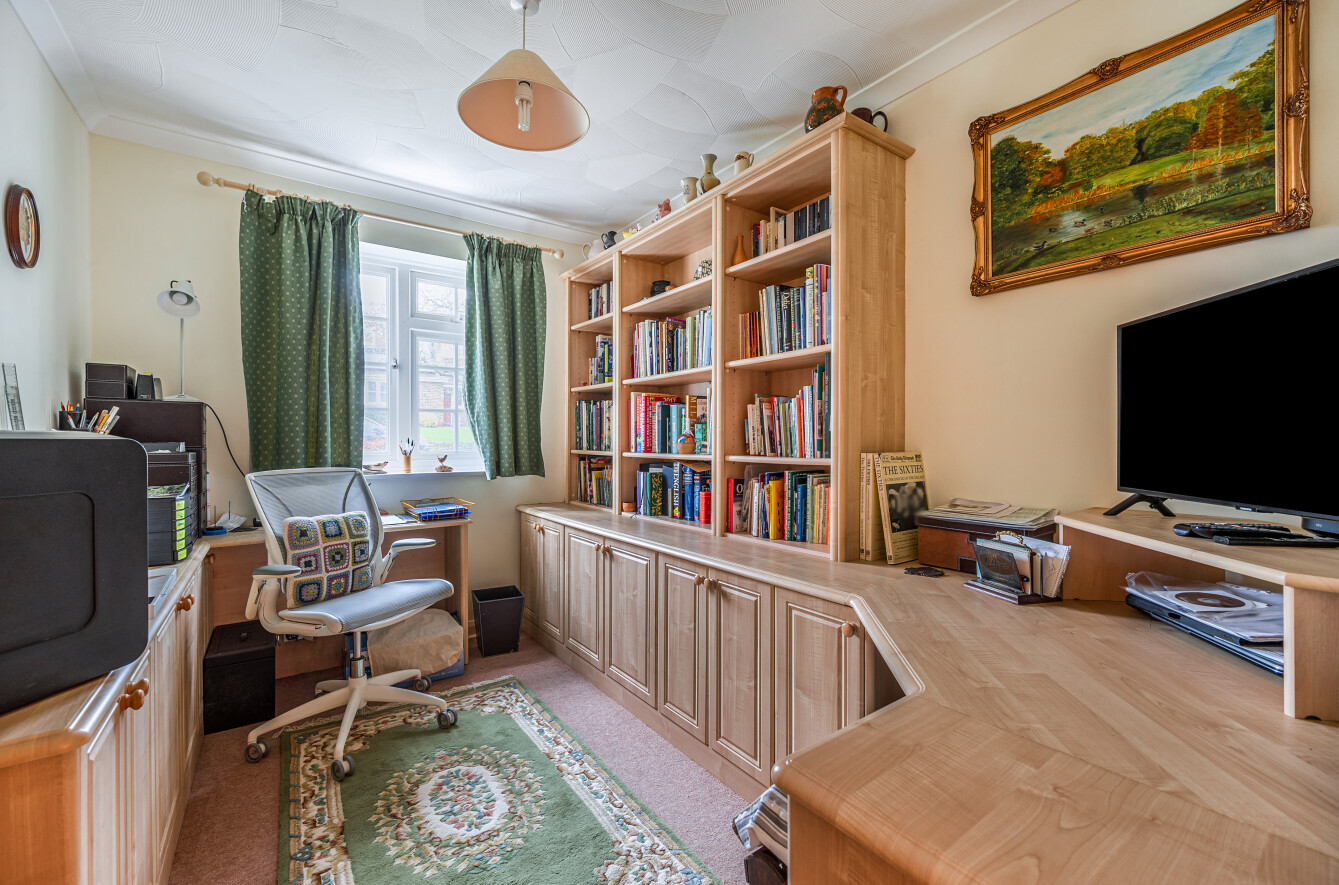 The well proportioned accommodation is neatly presented, having been updated in parts offering further scope, if so desired. Features include the south facing sitting/dining room with stone fireplace housing a coal effect gas fire, enjoying a pleasant aspect to rear overlooking the garden. The kitchen/breakfast room is comprehensively fitted by local firm Martins of Hawkhurst, including base and eye level units, glazed fronted display cabinets, granite worktops and integral appliances including Neff electric oven and grill, De Dietrich gas hob, Miele dishwasher and fridge. A South facing aspect is also enjoyed across the garden. A door leads to an integral passageway with doors both to the front and rear gardens. Access to a cloaks/utility room with white close coupled wc, wash hand basin, space and plumbing for a washing machine and space above for a tumble drier. From the hallway, doors lead off to three bedrooms incorporating two double rooms both with an aspect to front. The third bedroom has been fitted out as an office including desktops storage cupboards, book and display shelving by Hammonds. The showroom is fitted with a white suite by Bathroom Solutions in 2018, including tiled vanity unit with inset wash hand basin, integral wc and walk-in shower with integrated shower over, tiled floor and part tiled surround.