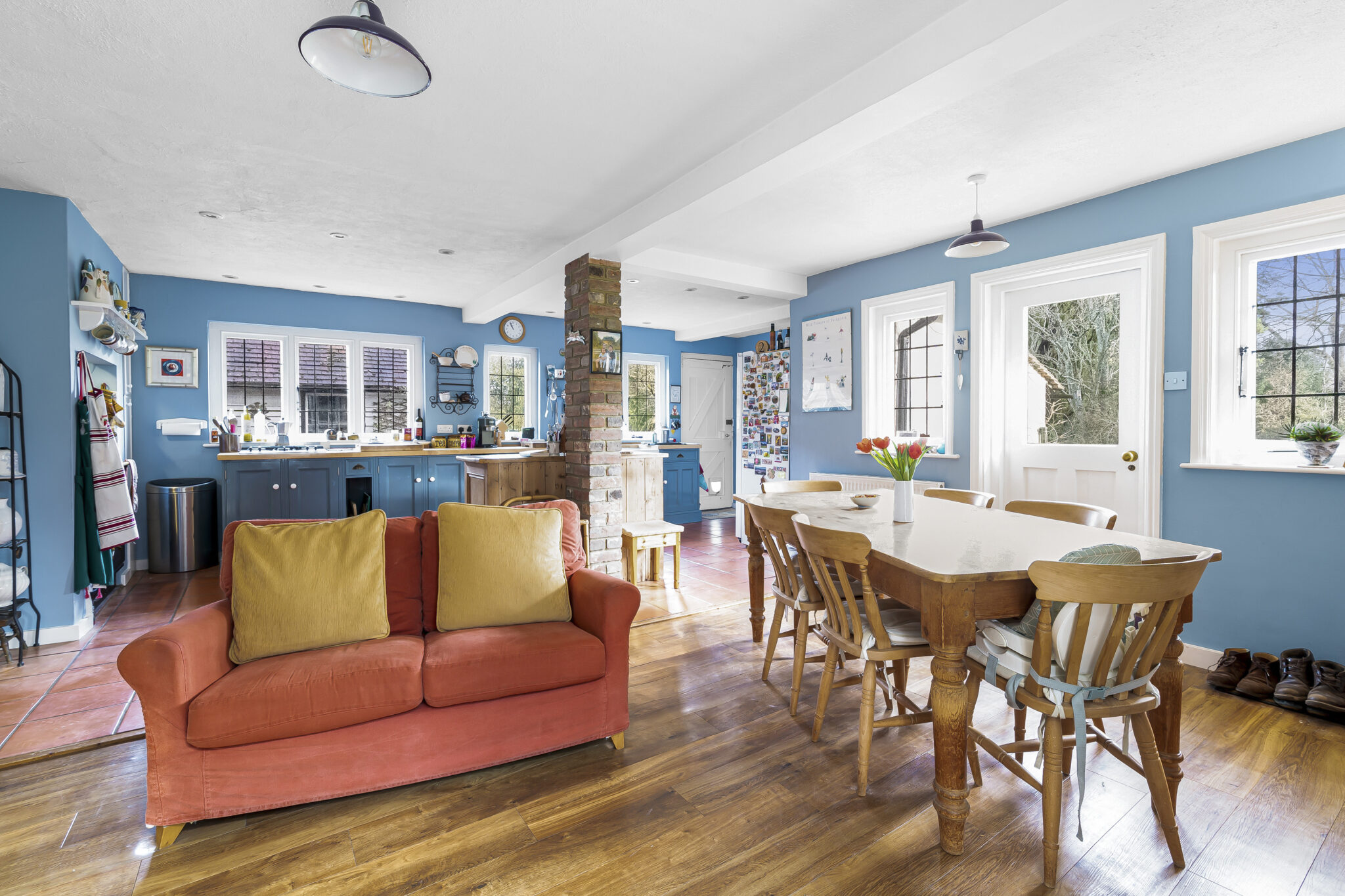 Edgehill is an individual, detached, double fronted family house ‘Arts and Crafts’ circa early 1900’s, presenting mixed elevations of brick, Kentish Ragstone and weatherboarding, set with a mixture of sealed unit double and single glazed timber casement windows, beneath pitched tiled roofs. The well proportioned, character accommodation, is arranged over two floors with features including two separate receptions rooms with bay windows, comprising a double aspect sitting room with fireplace, tiled inlay and hearth housing a wood burning stove, engineered oak flooring, picture rails, a dining room with fitted antique pine book shelving, an open fireplace with tiled inlay, wooden surround and overmantel, fitted desk top and an aspect to front. The kitchen/breakfast/family room is the heart of the house, with fireplace housing a woodburning stove, bespoke fitted solid wood units, fitted worksurface, twin butler sink, Stanley main gas fired range providing domestic hot water, central heating and cooking facility, integral appliances include Bosch dishwasher and a four burner gas hob. The flooring comprises terracotta quarry tiling and engineered oak. A useful utility and pantry includes space and plumbing for a washing machine. A traditional lean to conservatory has a brick floor and is fitted with power and light.