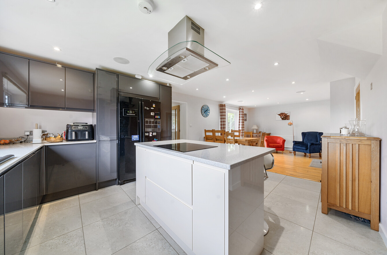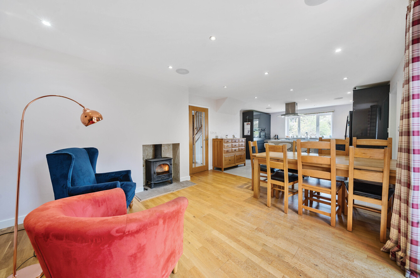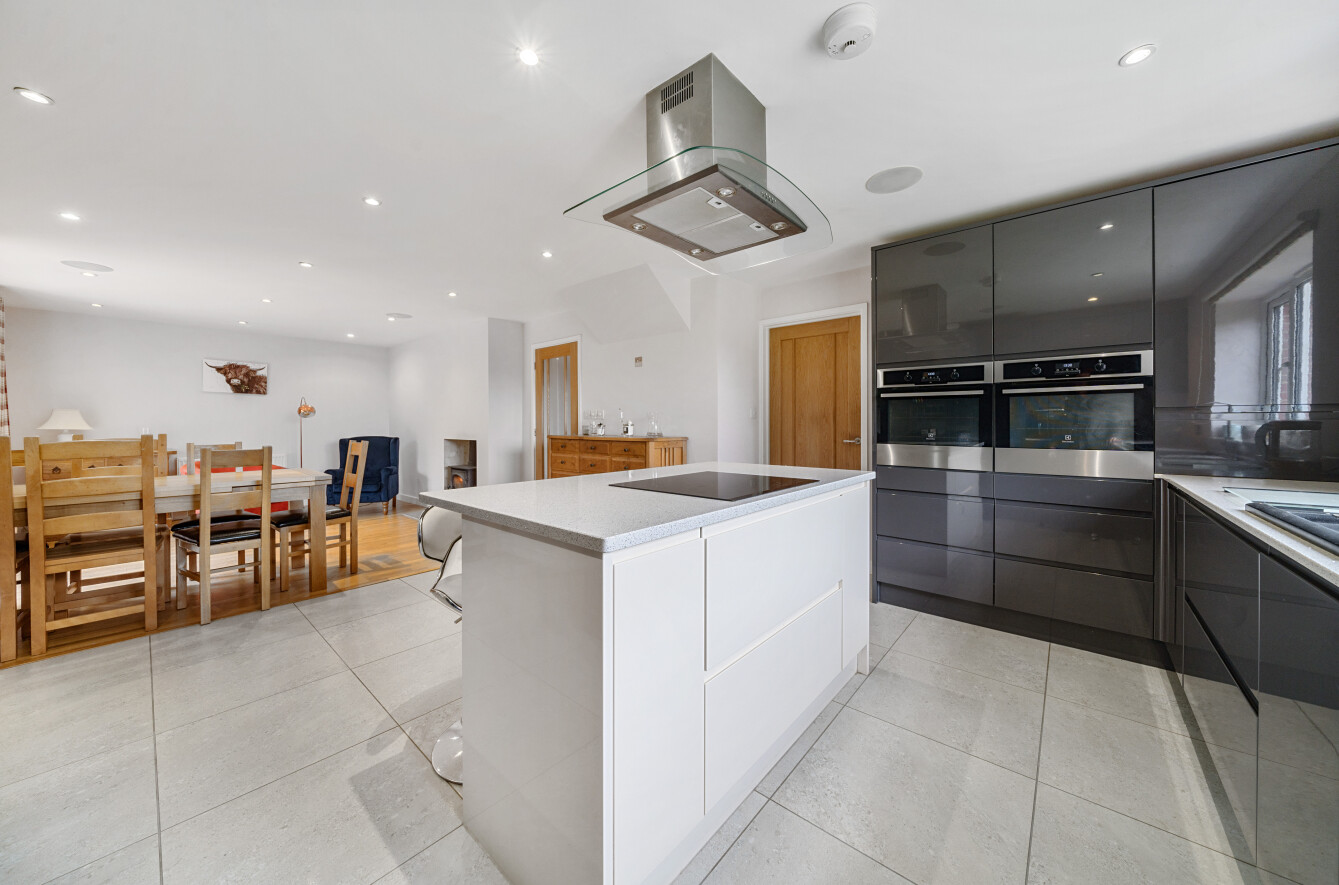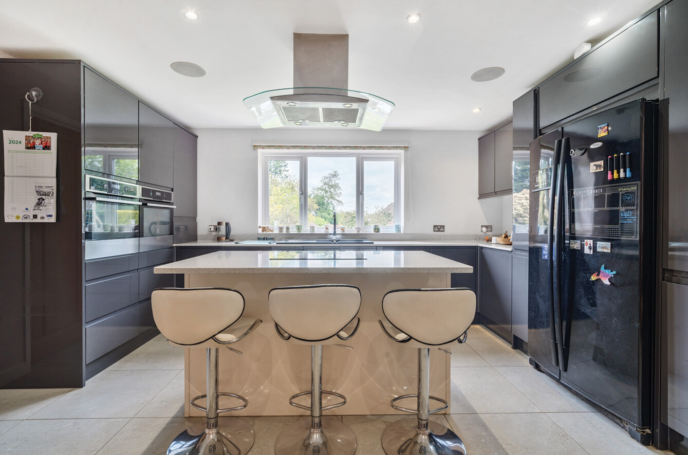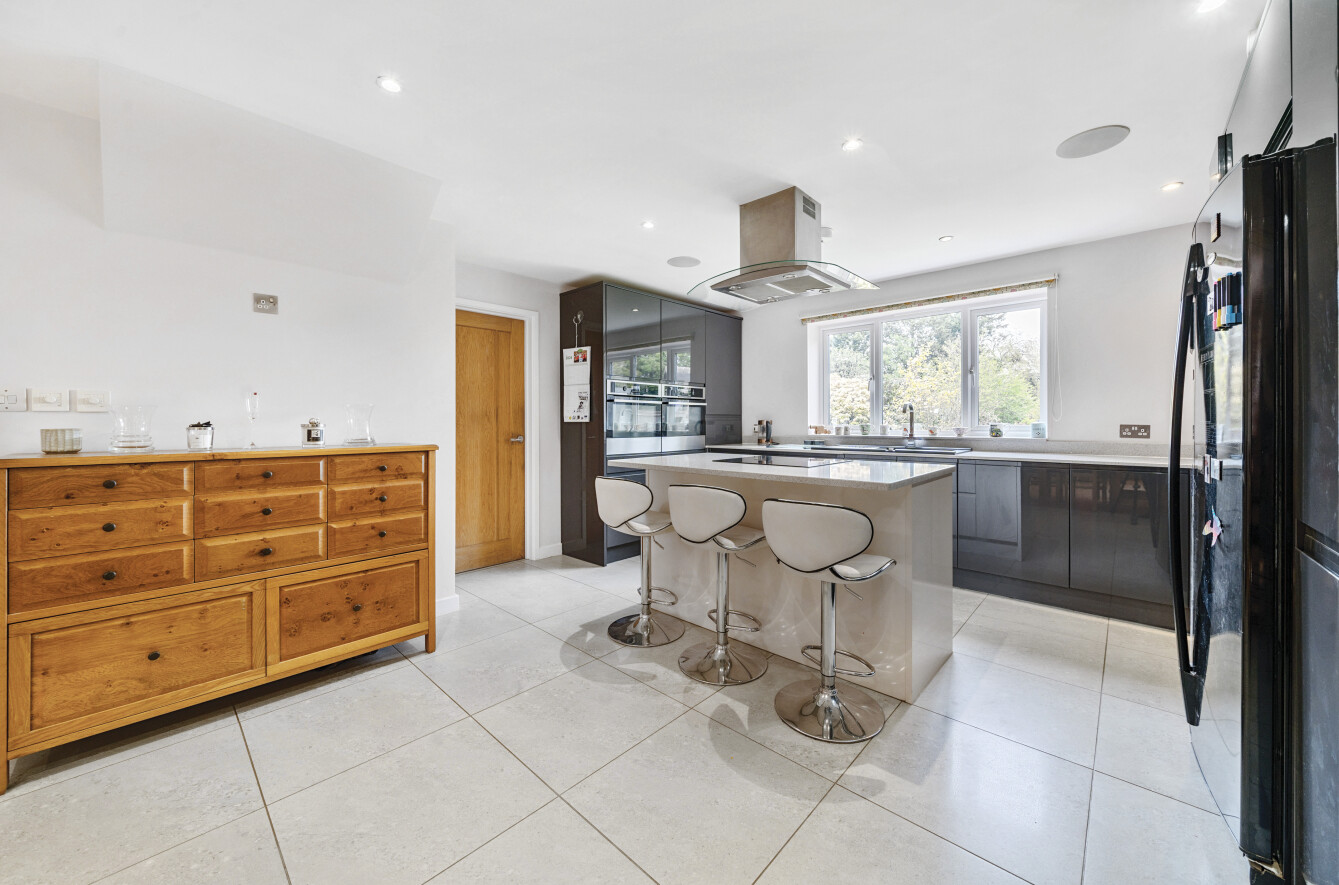 The kitchen is a wonderful modern space with a large kitchen island with an integrated electric hob, wall mounted ovens and bespoke wall and floor cabinets. The adjacent dining area has ample room for a large family dining table and French doors leading directly to the garden. The property also benefits from an integrated sound system with speakers in multiple rooms and a newly installed EV car charger in the drive.