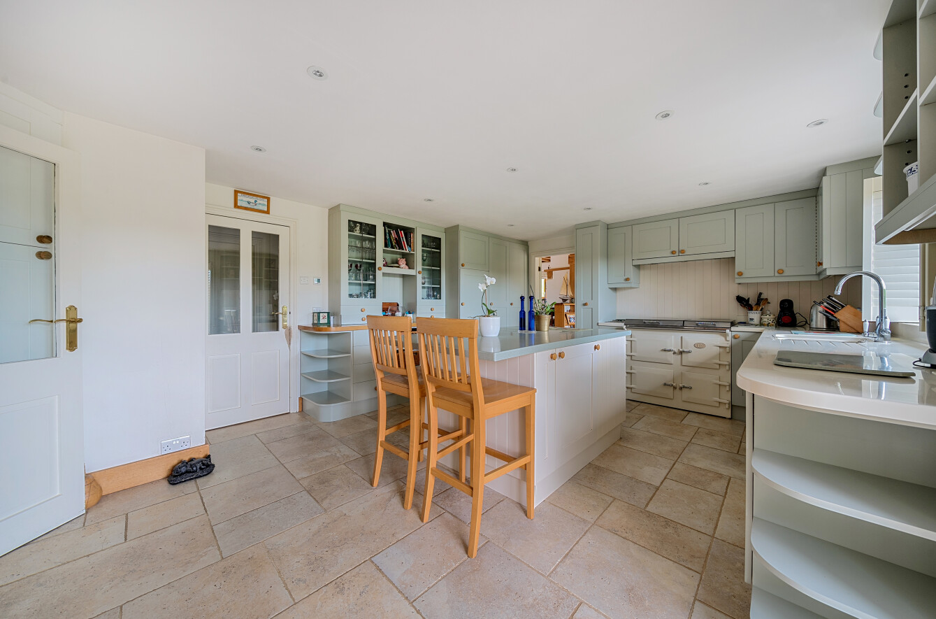 The property is entered through an impressive double height entrance hallway with original exposed beams which gives access to the bright and spacious open plan living/dining room which features a large double-sided wood burner, triple aspect windows allowing natural light to flood in, and French doors leading directly to the rear garden. From the living/dining room you enter the kitchen which is of excellent proportions and immaculately presented with flag stone flooring, bespoke wall and floor cabinets, a kitchen island, range cooker and ample worktop space. The kitchen has French doors leading directly to the rear garden and there is also a large utility room.