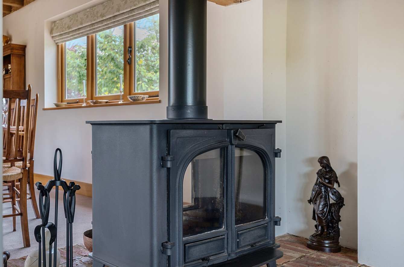 The detached annexe has been converted into a two-bedroom property with an additional office room and a well-proportioned kitchen with underfloor heating, a utility room with sink, a range of base and wall cabinets and tiled flooring. The adjacent sitting room has doors leading to the front garden and a wood burning stove. There is also an attached single garage.