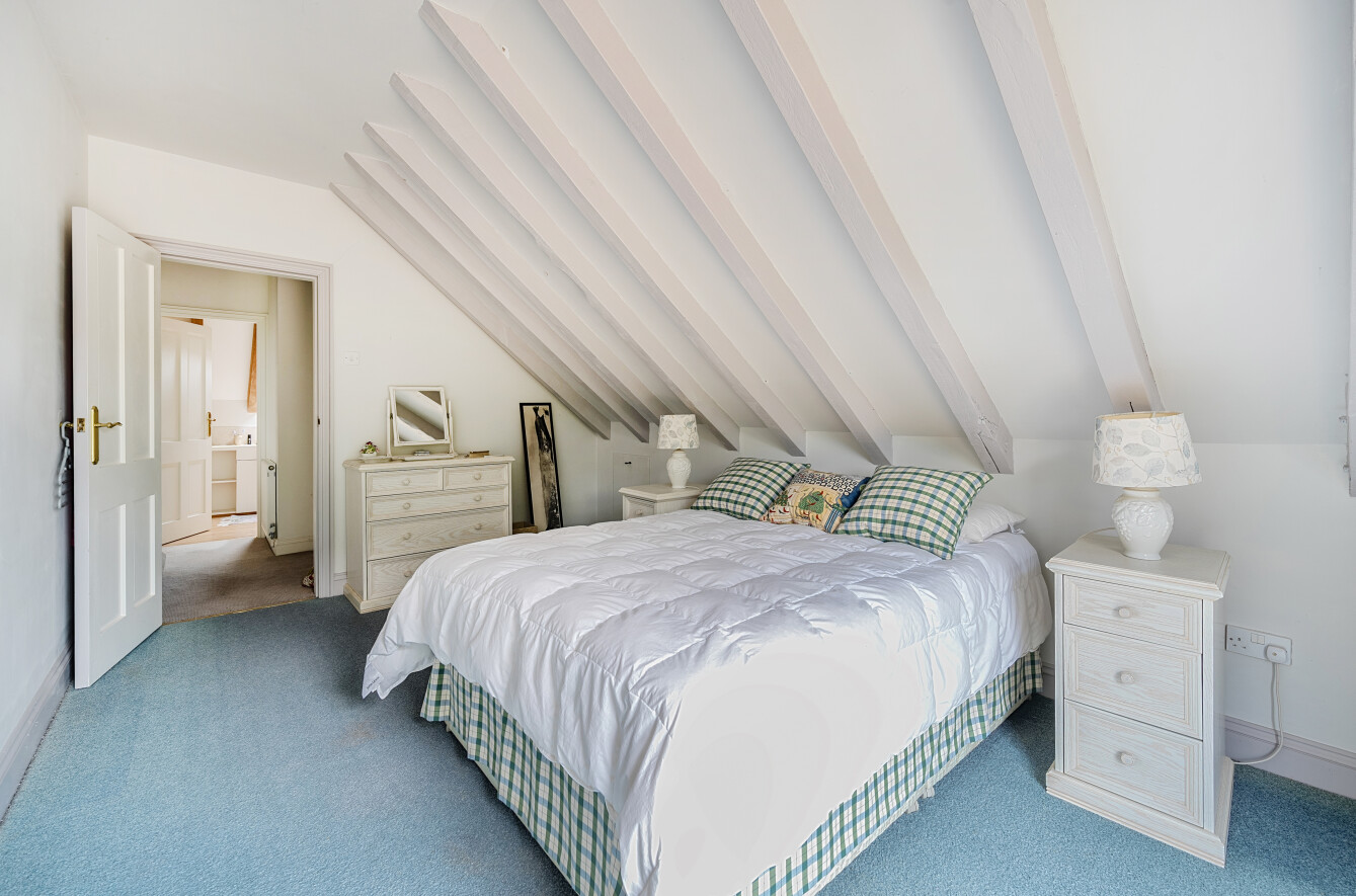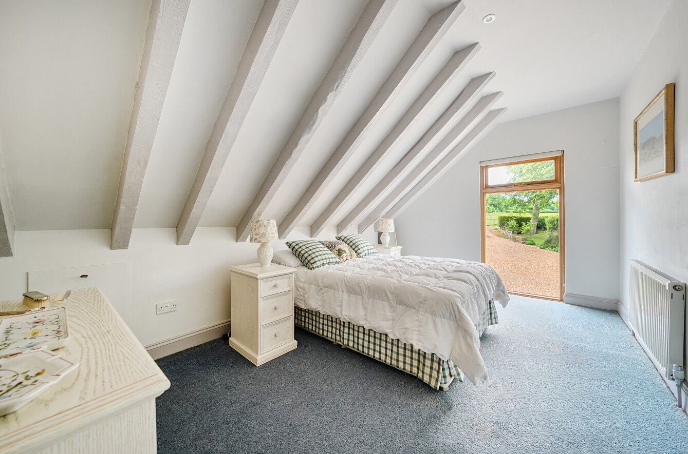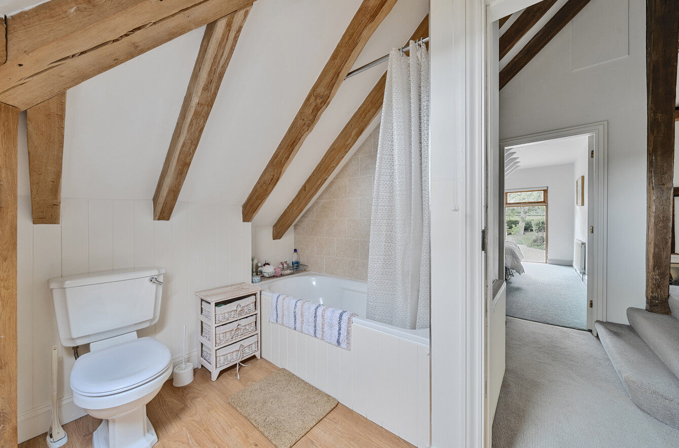 Upstairs, a central landing leads to the three bedrooms and the family bathroom. The principal bedroom has an impressive, vaulted ceiling showcasing the original exposed beams and a modern ensuite bathroom with additional shower.