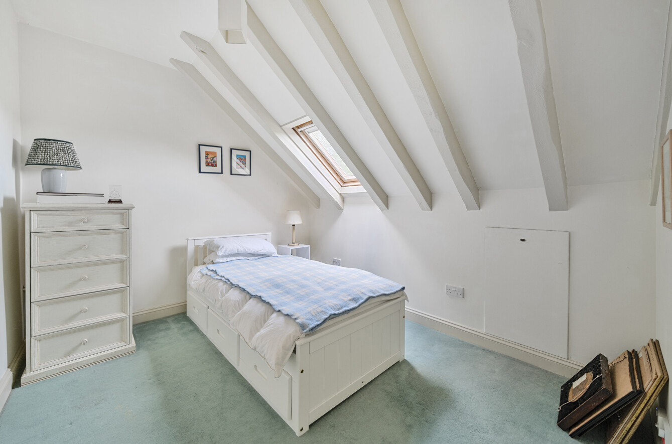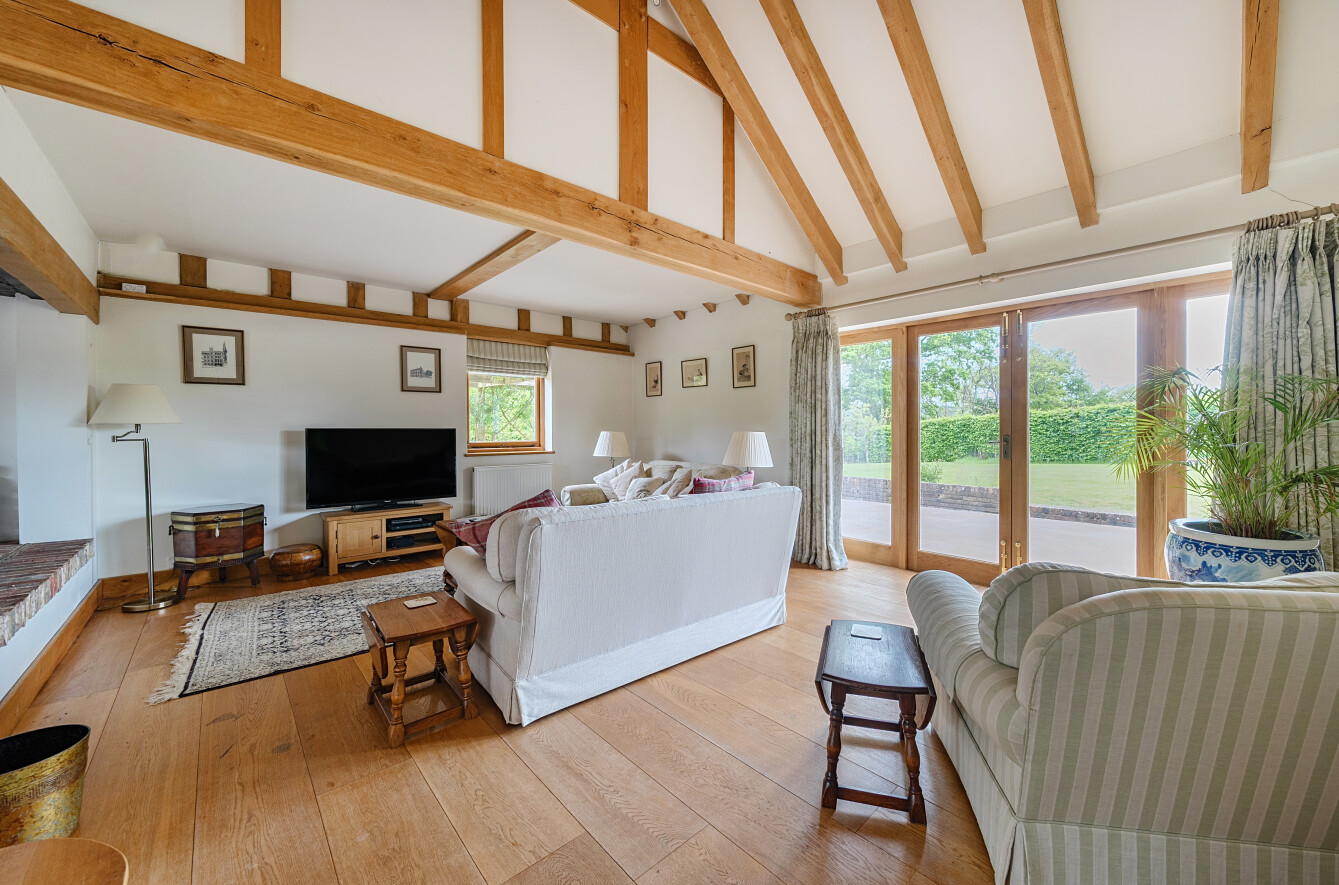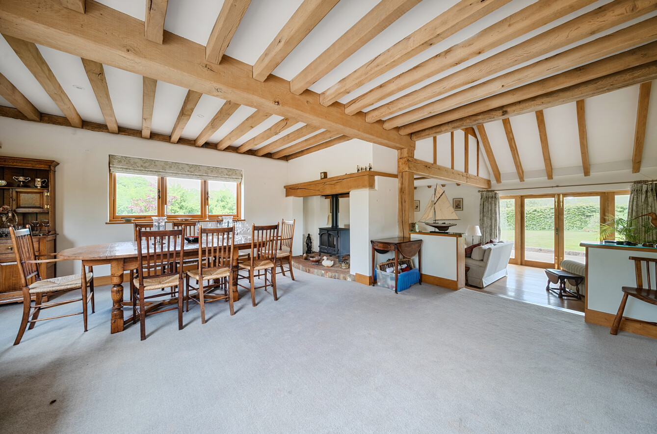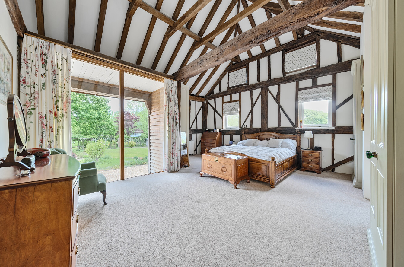 Upstairs, a central landing leads to the three bedrooms and the family bathroom. The principal bedroom has an impressive, vaulted ceiling showcasing the original exposed beams and a modern ensuite bathroom with additional shower.