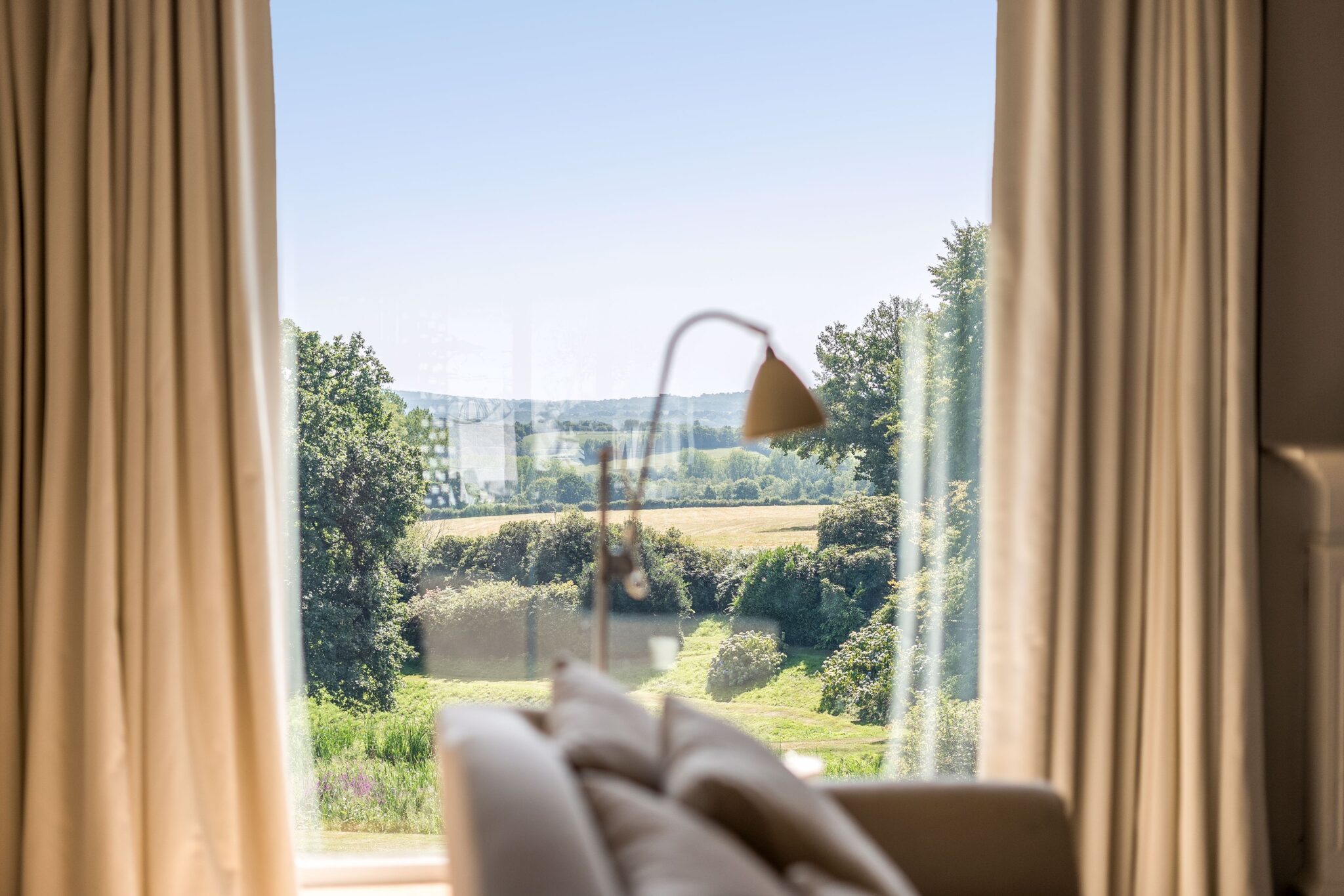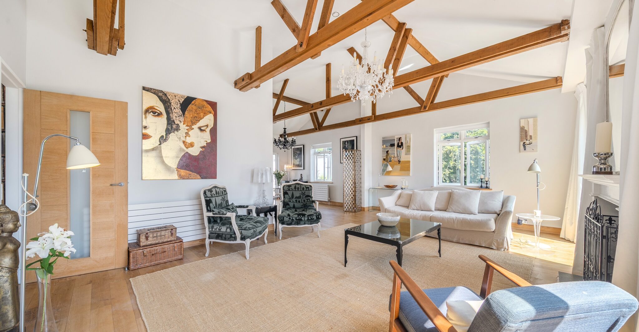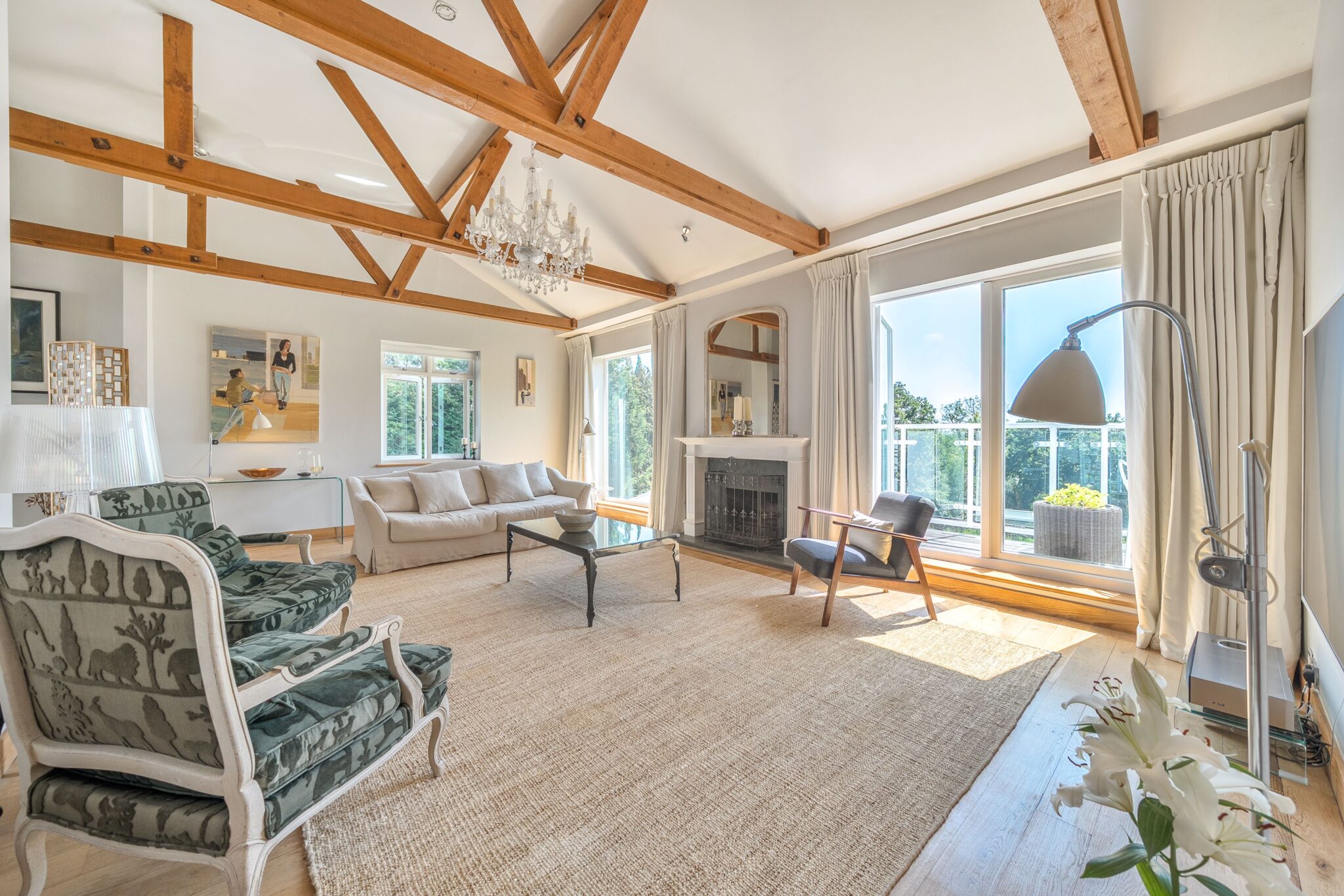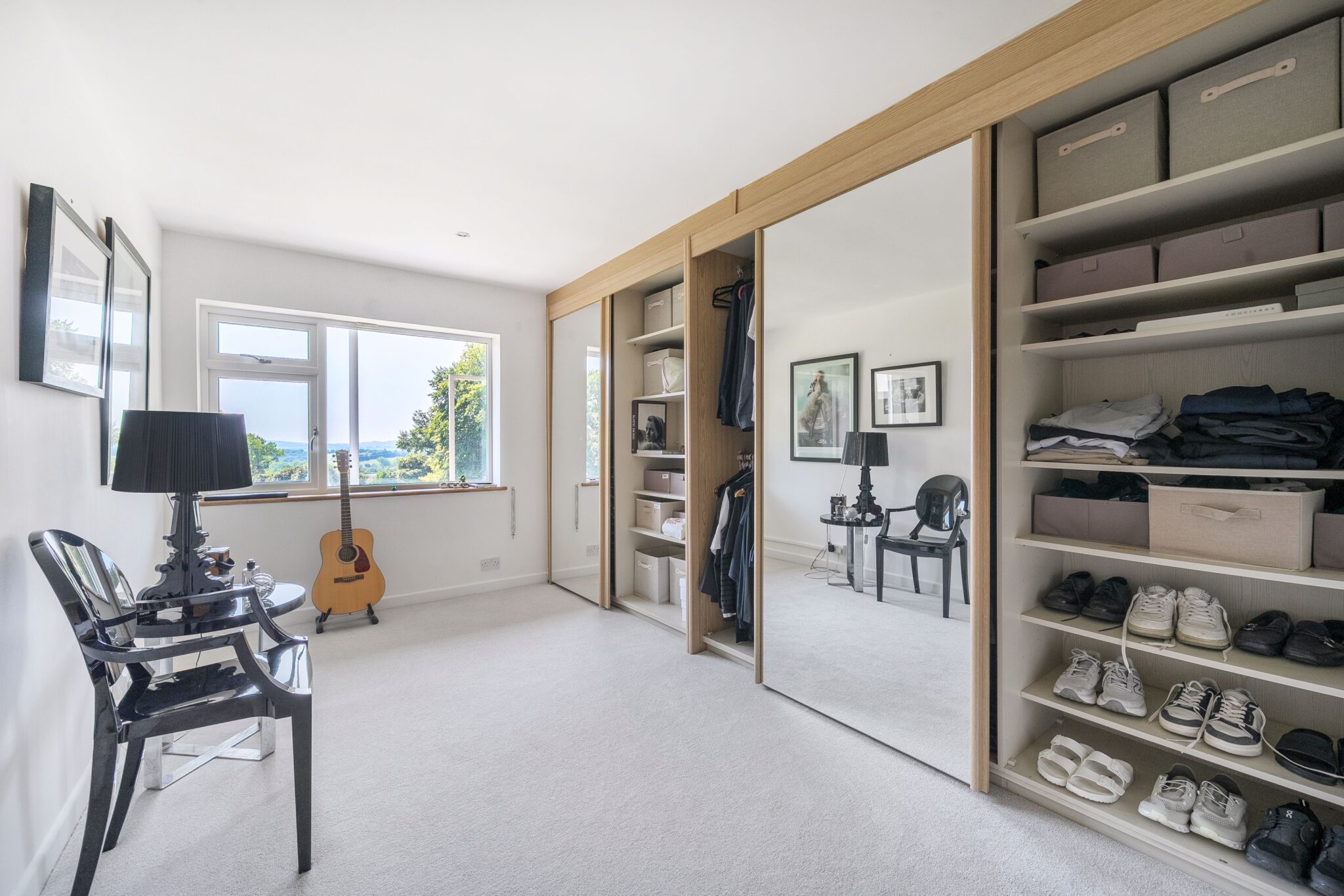 This mid-century property is a wonderful family home with a large L-shaped sitting/dining room accessed directly from the kitchen with a vaulted ceiling and French doors leading to a balcony with truly beautiful uninterrupted views across the wrap-around garden and surrounding countryside. The modern kitchen is of an excellent specification with bespoke wall and floor cabinets, a large kitchen island, quartz work top and integrated appliances. The studio and gym is a new addition to the property while the sunroom leads directly to the courtyard garden, pagoda covered terrace and steps to the swimming pool and the gardens, ponds and woodland beyond. Downstairs, the master bedroom features a magnificent ensuite bathroom with feature lighting and a raised freestanding bath.