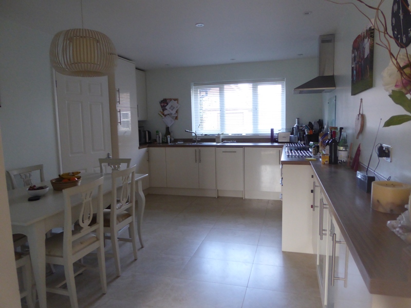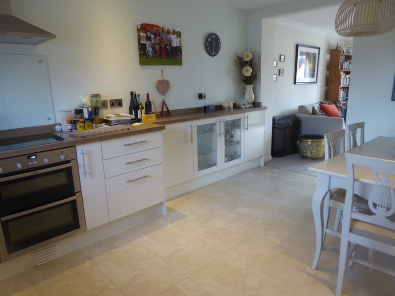Fitted KITCHEN / DINER with range of kitchen units, integrated ceramic hob and electric oven, washing machine and dishwasher. Fridge/freezer. Space for table and chairs. Open to:
