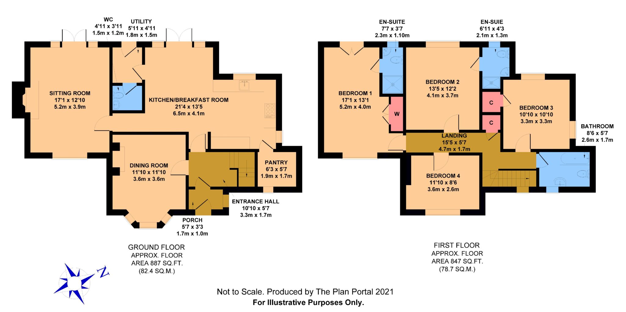 The accommodation on the ground floor comprises: front door opens into an entrance porch providing coat hanging space with shoe storage and there is a door to a main entrance hall. From the main hall is a turned staircase to the first floor landing and doors to the dining room and kitchen/breakfast room. The dining room has a bay window to the front and has a central open fireplace with a woodburner inset. The kitchen/breakfast room enjoys open aspect views over the rear garden and has French doors to a brick paved terrace. There are further doors to the sitting room, a walk-in pantry and rear lobby/utility room. The kitchen has a range of wall, base and drawer units with a double bowl ceramic sink set into a wooden worktop. There is an integrated dishwasher and a six ring gas fired range cooker and space for a free standing fridge/freezer. The rear lobby/utility room houses a wall mounted gas fired boiler with a door to the garden terrace and to a separate cloakroom. There is space and plumbing for a washing machine, dryer and storage for coats and shoes. The sitting room enjoys a double aspect allowing light from front to back with French doors opening to the garden terrace and there is a central, pretty exposed brick open fireplace. On the first floor landing are doors to a family bathroom and four double bedrooms with two benefiting from en-suite shower rooms.