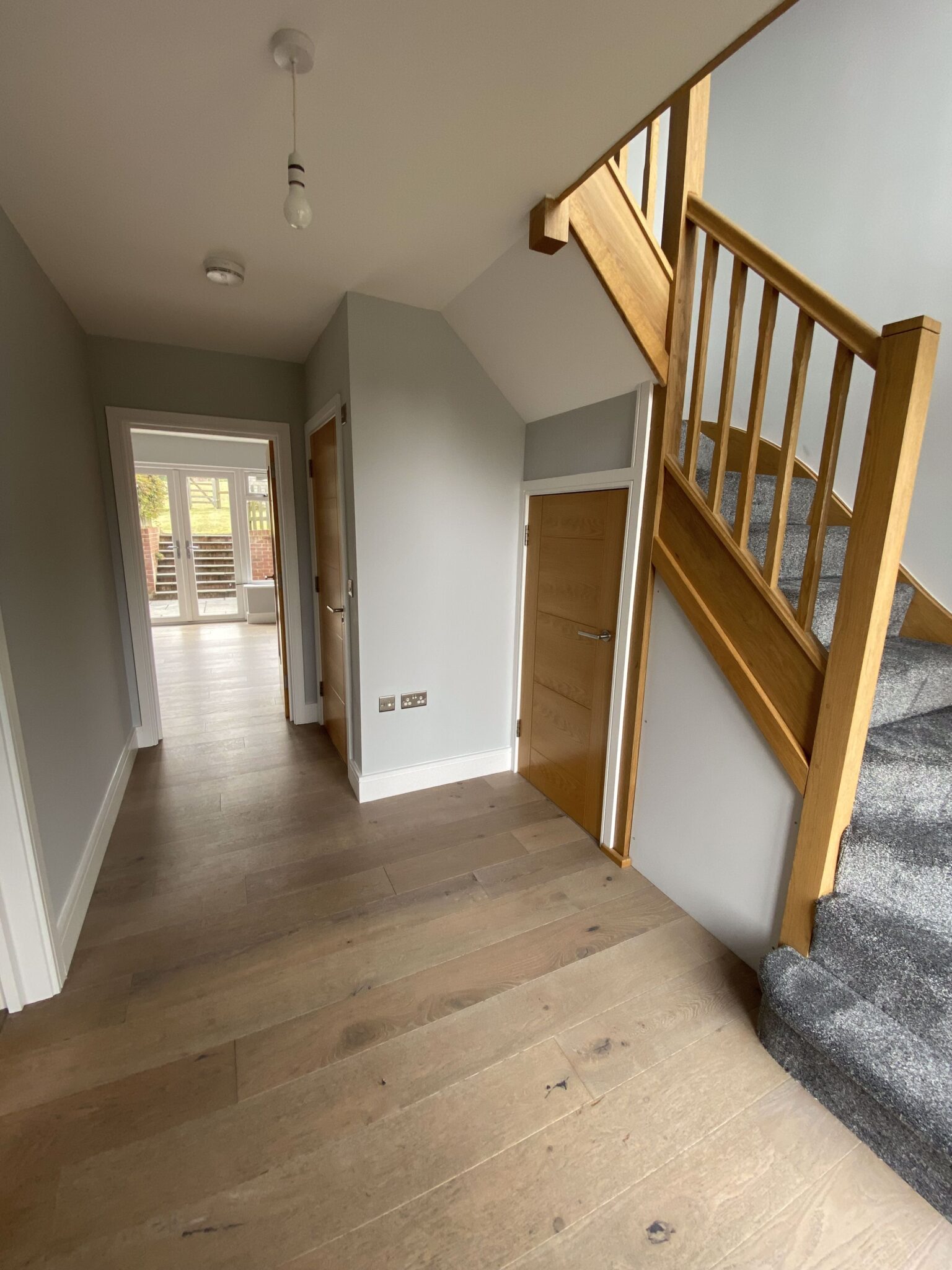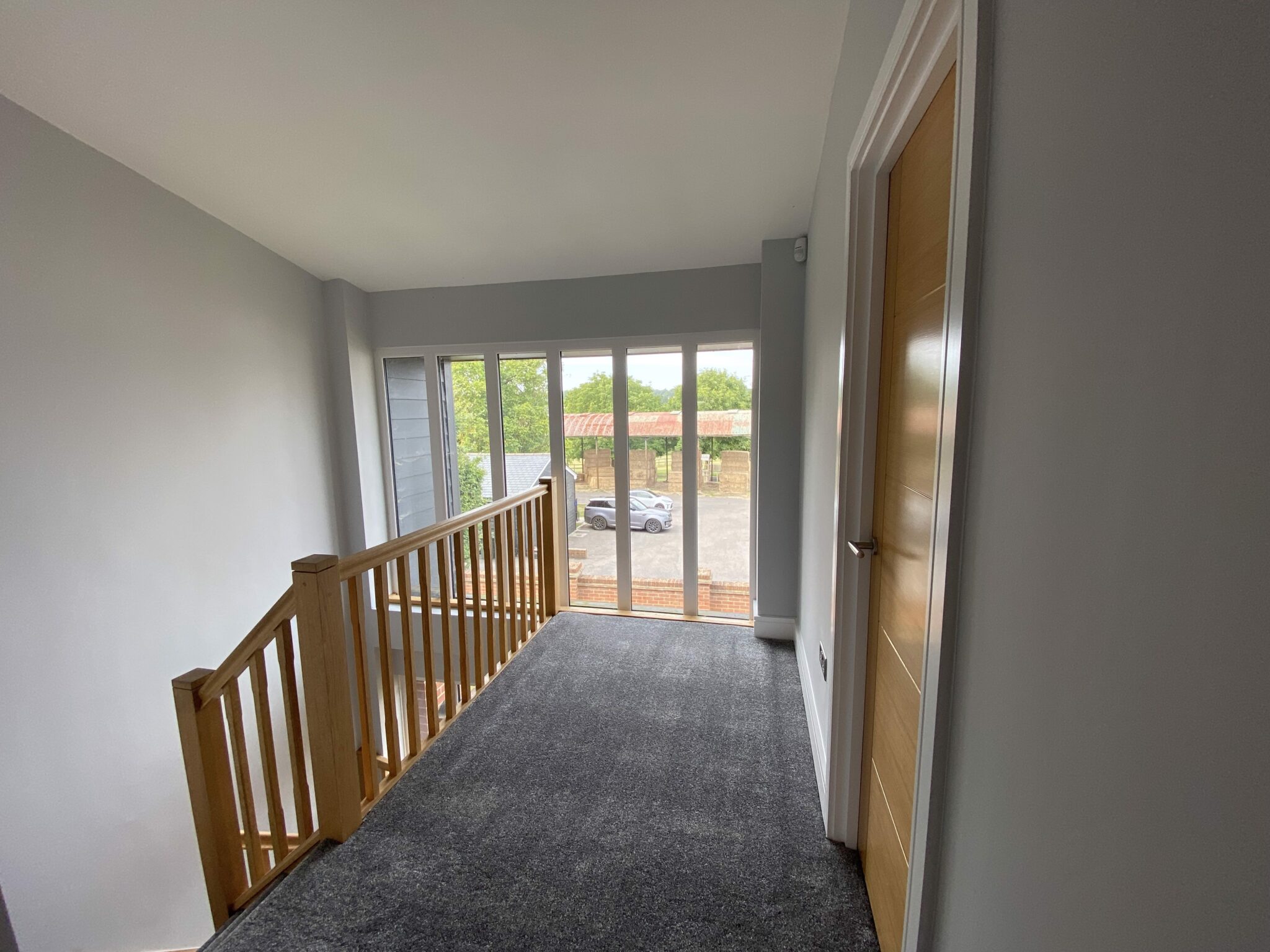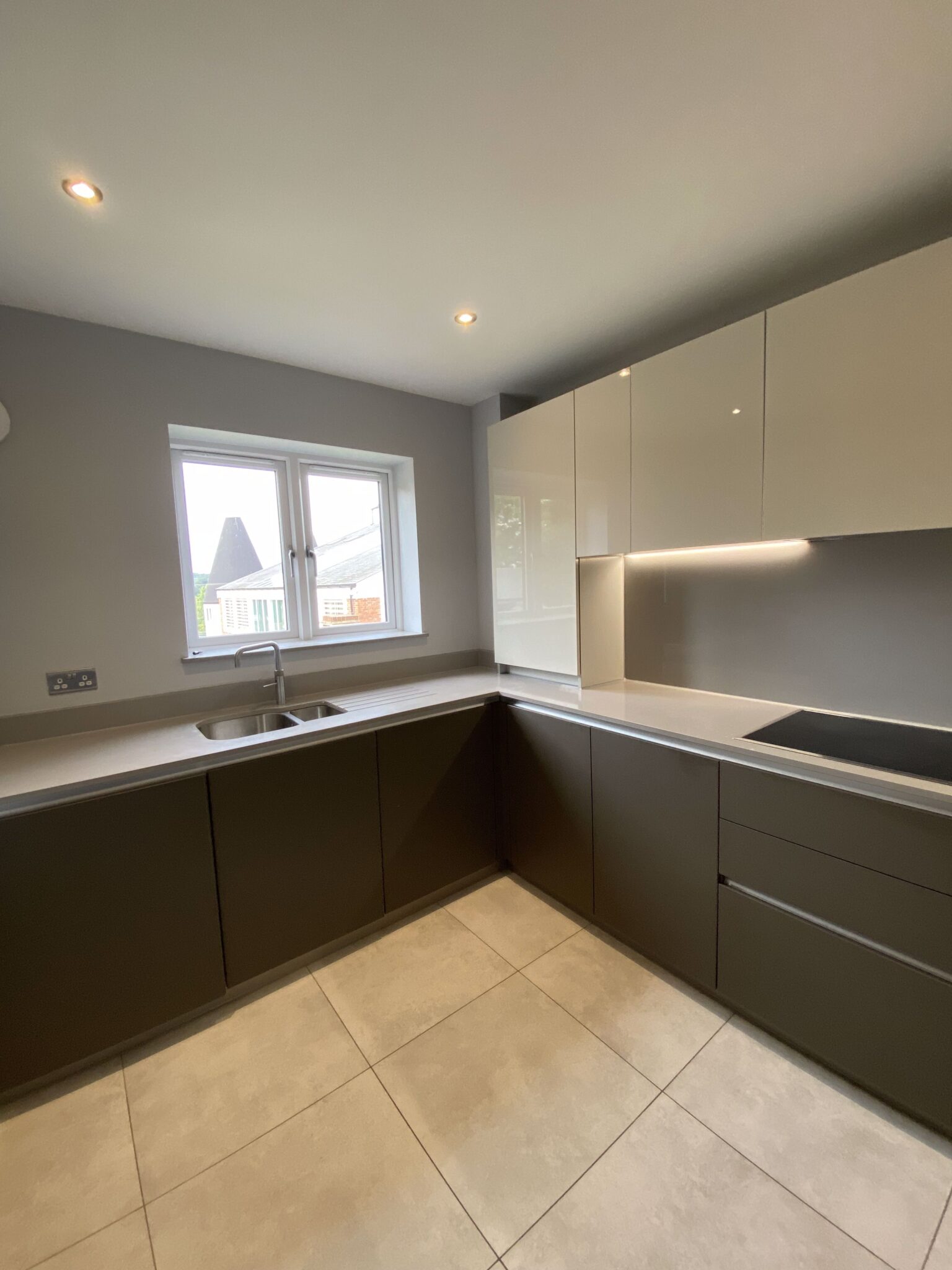 Front door to entrance hall with floor to ceiling windows. Oak staircase to first floor, grey laminate floor and doors to: Cloakroom: Fully tiled with tiled floor, modern white WC, wash hand basin in vanity unit, chrome radiator. Fitted kitchen with two tone with a range of wall and floor units, pale grey speckled granite work surfaces and drainer, stainless steel one & half sink with boiling tap. Integrated washer dryer, dishwasher, fridge freezer, ceramic hob and eye level electric double oven top oven/microwave. All appliances are Smeg. Tiled floor with underfloor heating.