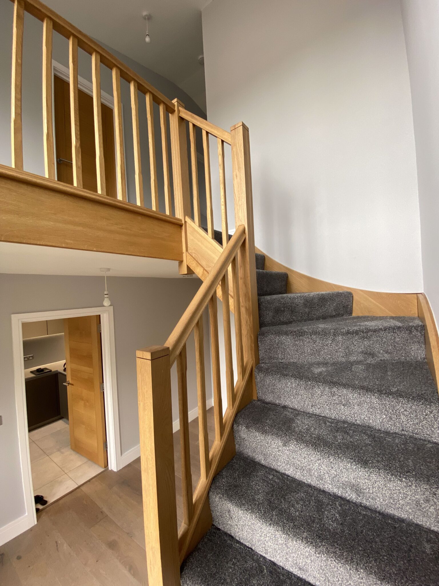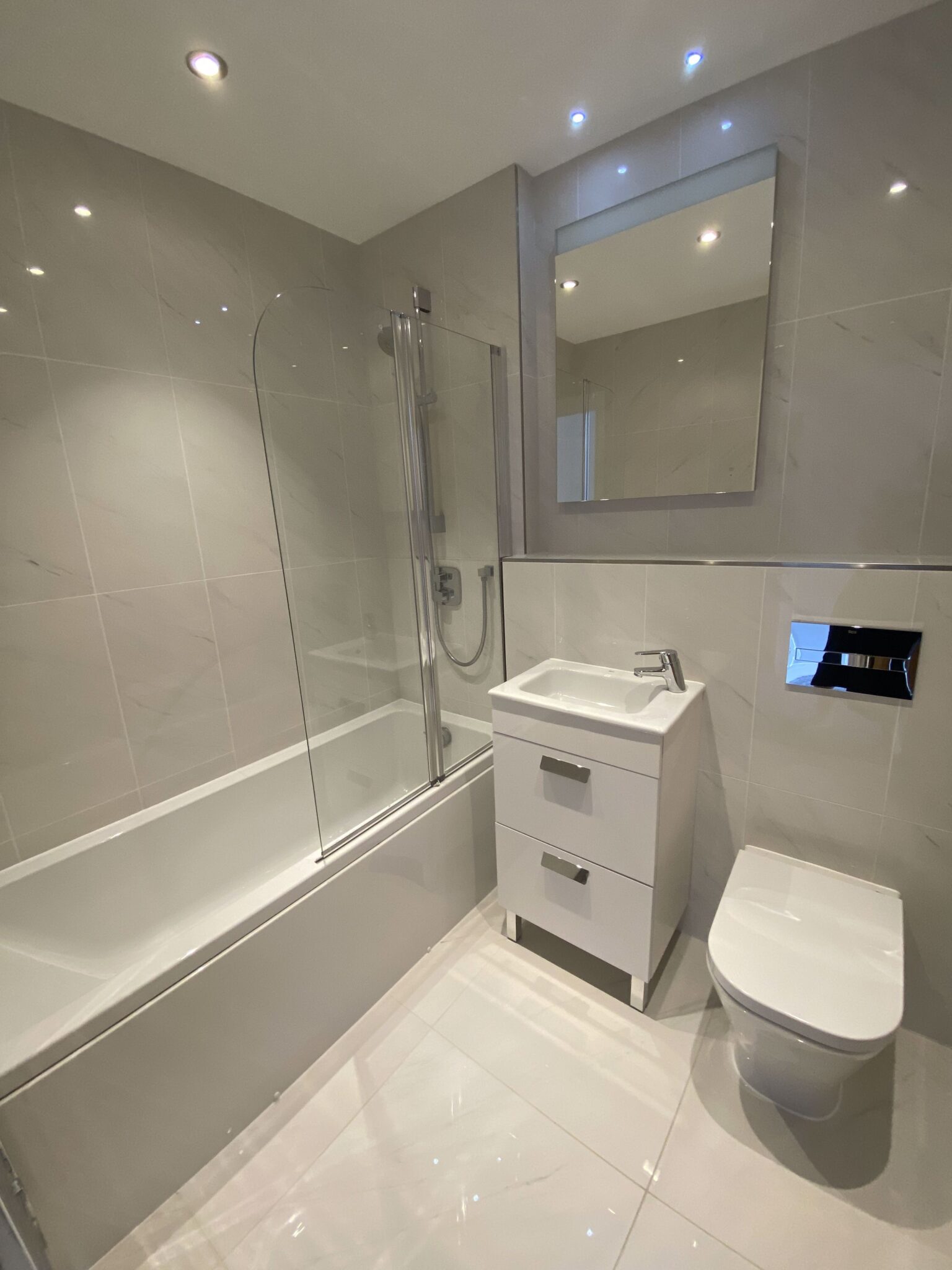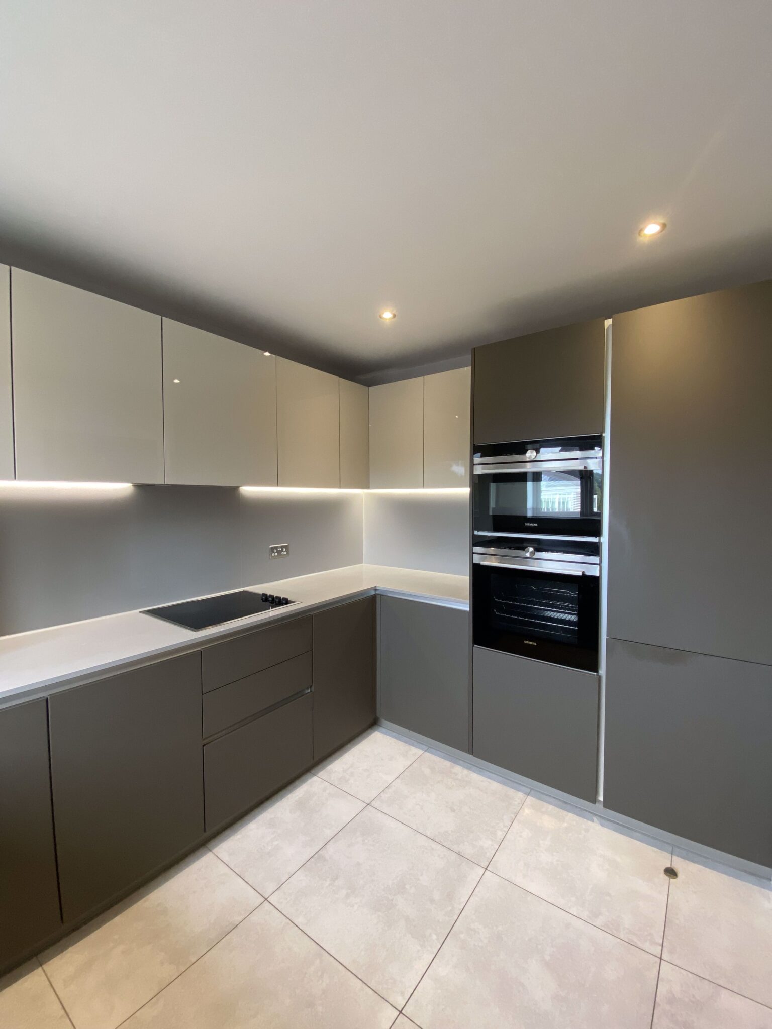 Front door to entrance hall with floor to ceiling windows. Oak staircase to first floor, grey laminate floor and doors to: Cloakroom: Fully tiled with tiled floor, modern white WC, wash hand basin in vanity unit, chrome radiator. Fitted kitchen with two tone with a range of wall and floor units, pale grey speckled granite work surfaces and drainer, stainless steel one & half sink with boiling tap. Integrated washer dryer, dishwasher, fridge freezer, ceramic hob and eye level electric double oven top oven/microwave. All appliances are Smeg. Tiled floor with underfloor heating.