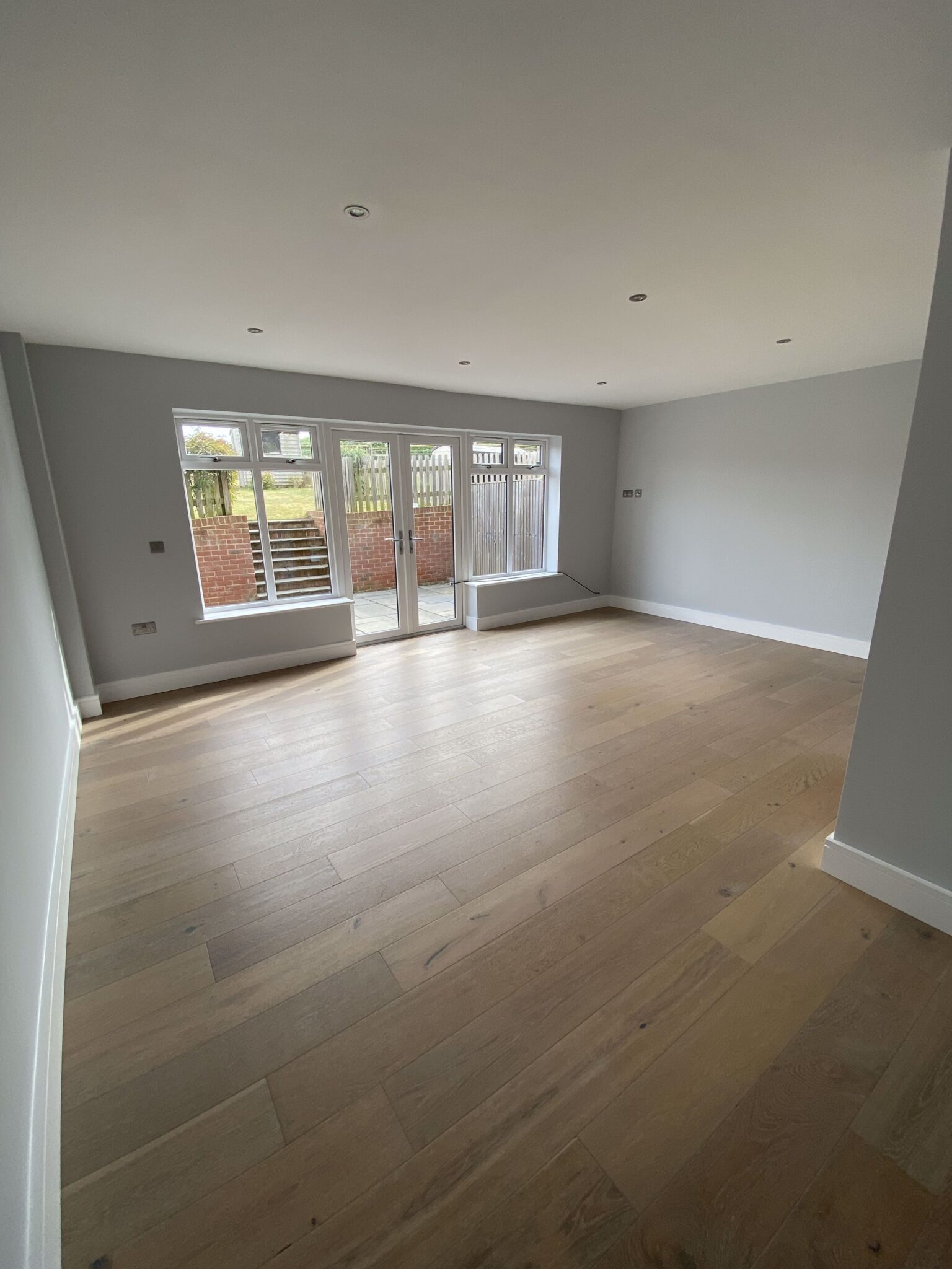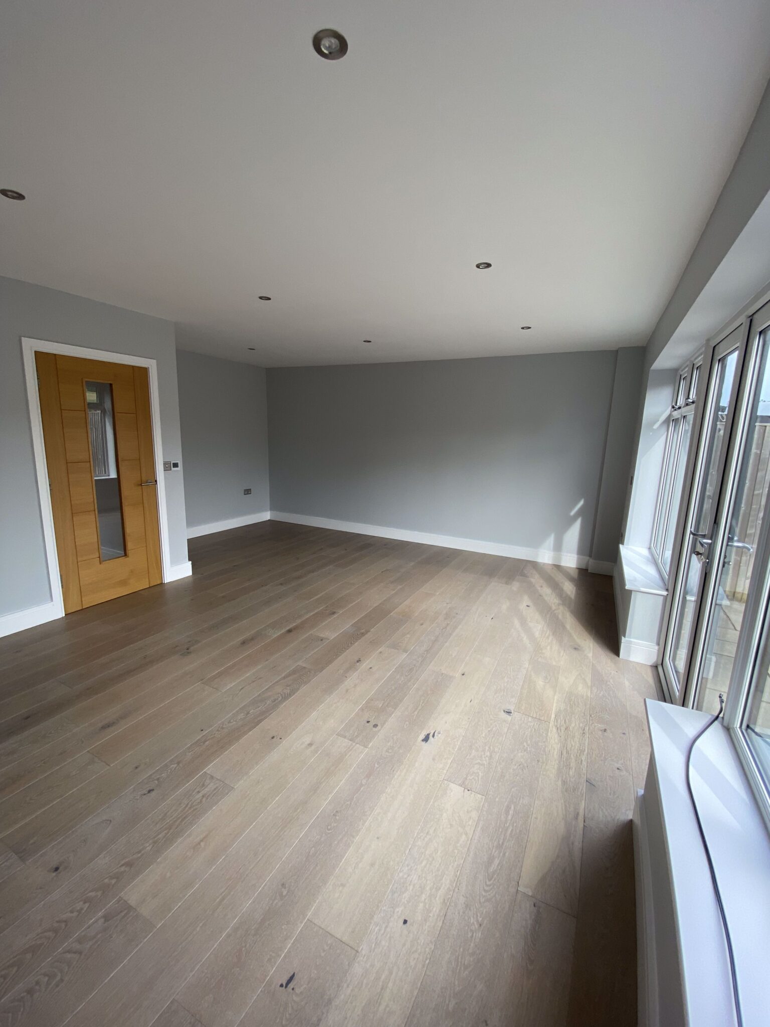 Door to sitting/dining room, good size spacious light room with french doors and windows to each side . Space for dining table. Wood effect flooring with underfloor heating.
