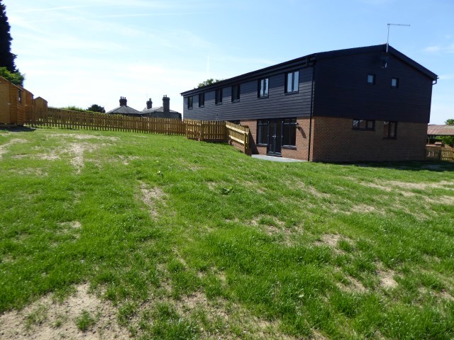 The property is approached by a paved path with lawn to the front.